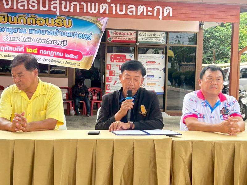 รายละเอียด : วันพฤหัสบดีที่ 24 กรกฎาคม 2568 เวลา 13.00 น. นางสาวสิริกัลยา เนตรอินทร์ นายกเทศมนตรีตำบลตะกุด มอบหมายให้นายมานพ แสงสว่าง รองนายกเทศมนตรี และเจ้าหน้าที่เทศบาล ร่วมกับโรงพยาบาลส่งเสริมสุขภาพตำบลตะกุด ฝ่ายปกครอง ชมรมผู้สูงอายุ ทต.ตะกุด และอสม. ร่วมต้อนรับและถ่ายทอดความรู้ในเรื่อง “ การดำเนินงานด้านชุมชนที่เป็นมิตรกับผู้สูงอายุ“ ให้กับคณะศึกษาดูงานจากเทศบาลตำบลบางเสร่ อำเภอสัตหีบ จังหวัดชลบุรี จำนวน 120 ท่าน ณ อาคารอเนกประสงค์โรงพยาบาลส่งเสริมสุขภาพตำบลตะกุดโดยในงานยังมีการแสดงสินค้าผ้าอัตลักษณ์ท้องถิ่นของตำบลตะกุด ”ผ้าลายตะกุด , Popcornหลากรส โดย ทต.ตะกุด , สินค้าและผลิตภัณฑ์ผ้า Handmade หมู่ที่ 6 และขนมไทย เพื่อเป็นการประชาสัมพันธ์สินค้าของตำบลตะกุดให้แก่ผู้เข้ารับการศึกษาดูงาน