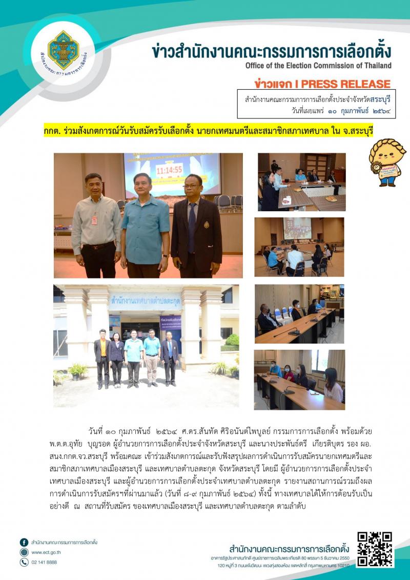 ผู้อำนวยการการเลือกตั้งประจำจังหวัดสระบุรี เข้าร่วมสังเกตการณ์ และรับฟังสรุปผลการดำเนินการรับสมัครนายกเทศมนตรีและสมาชิกสภาเทศบาลตำบลตะกุด