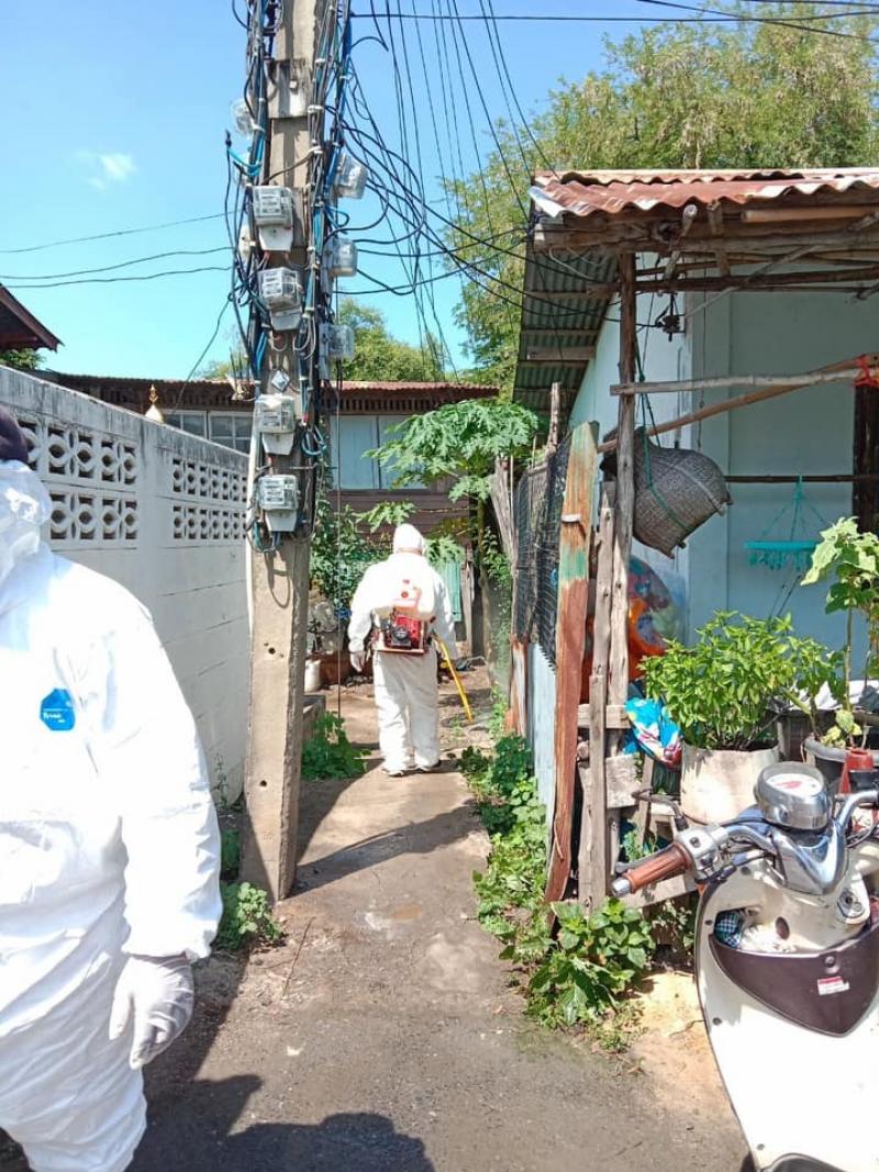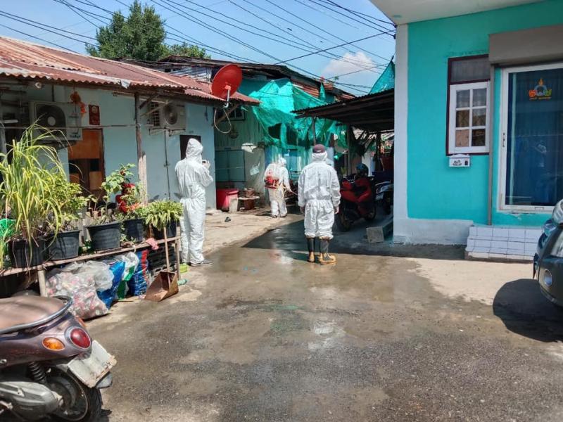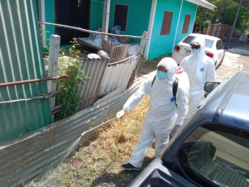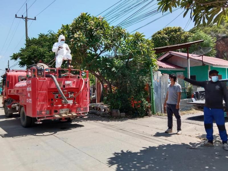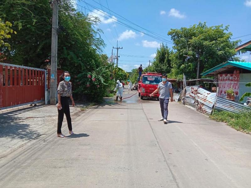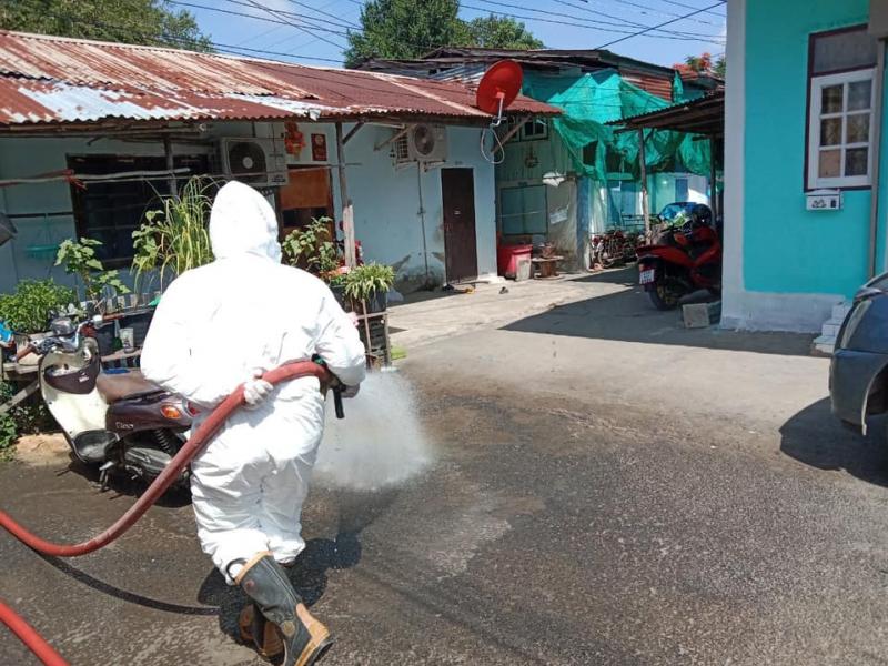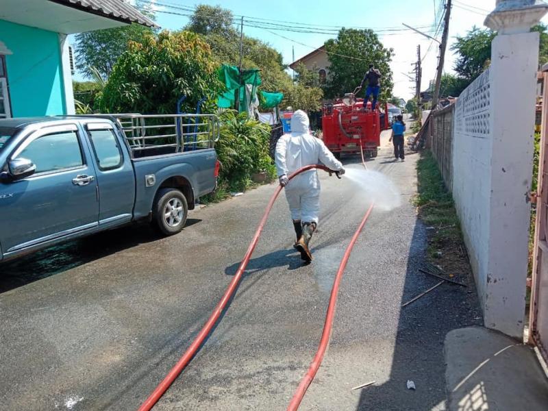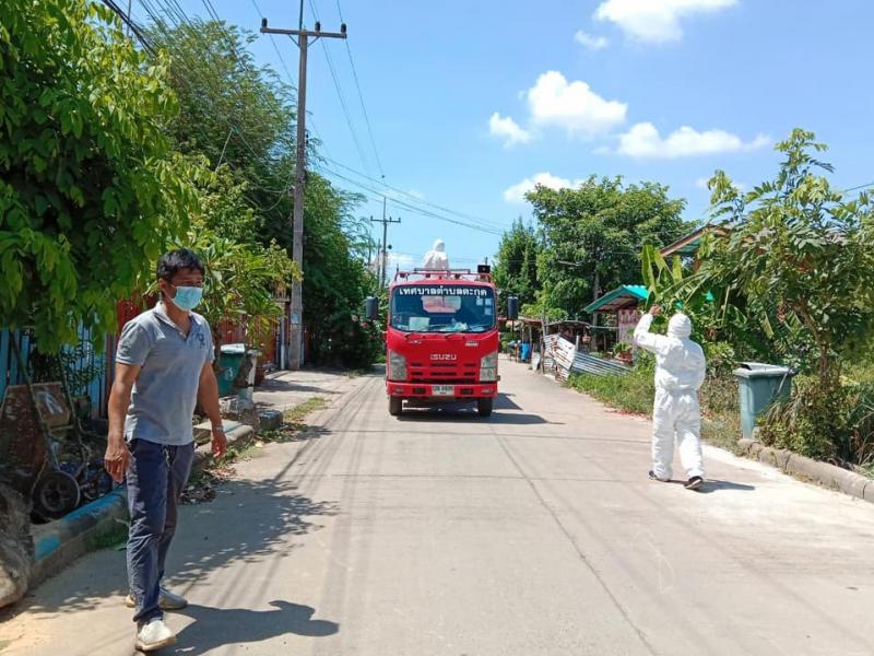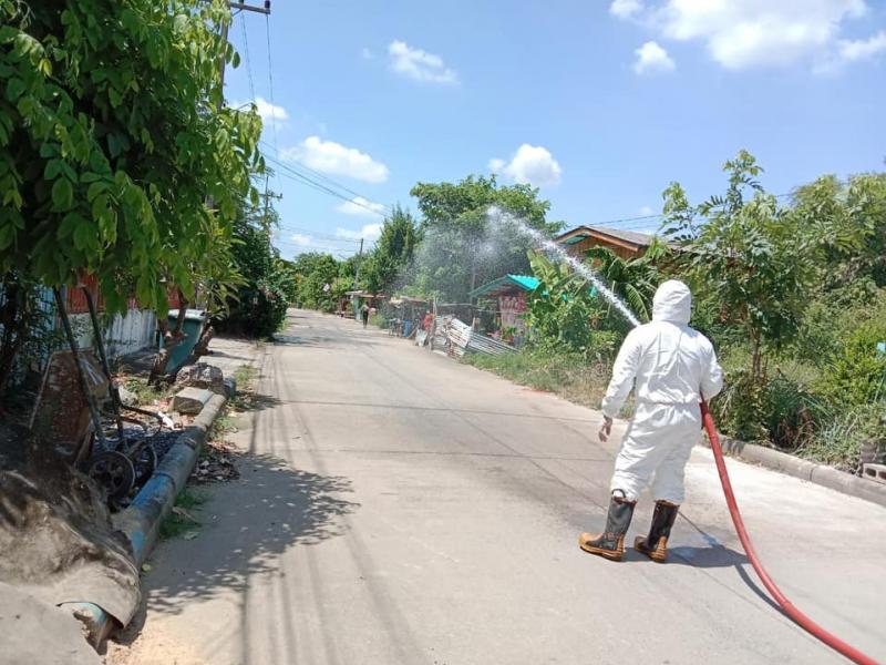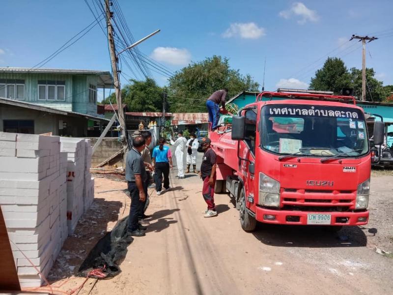 เจ้าหน้าที่ออกพ่นน้ำยาฆ่าเชื้อเนื่องจาก สถานการณ์การระบาดของโรคโควิด19 และพบว่าในพื้นที่หมู่ 2 และหมู่ที่ 6 ตำบลตะกุด