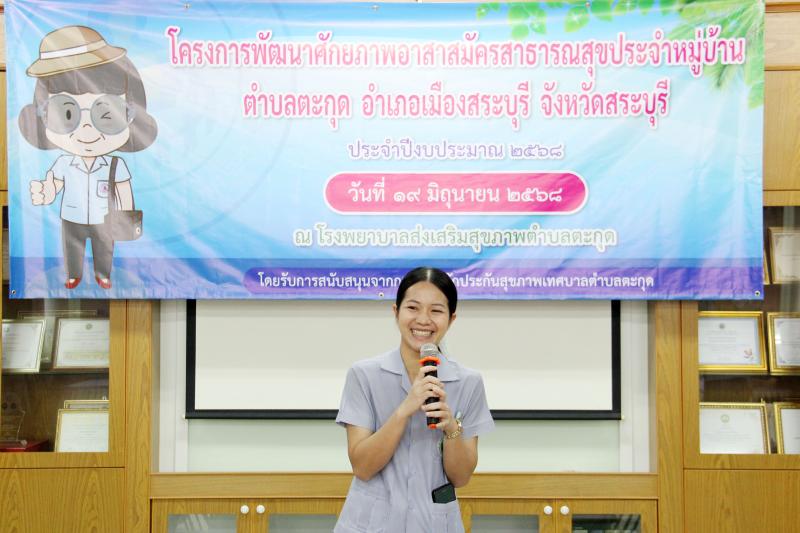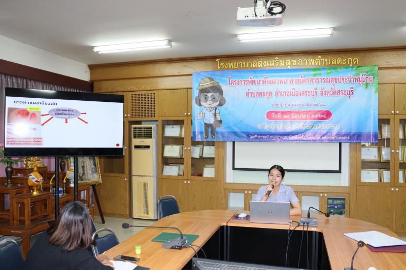 รายละเอียด : วันพฤหัสบดีที่ 19 มิถุนายน พ.ศ. 2568 เวลา 09.00 น. นางสาวสิริกัลยา เนตรอินทร์ นายกเทศมนตรีตำบลตะกุด ได้เป็นประธานในพิธีเปิดโครงการพัฒนาศักยภาพอาสาสมัครสาธารณสุขประจำหมู่บ้าน เรื่อง การปฐมพยาบาลผู้ป่วยเบื้องต้น ณ ห้องประชุมส่งเสริมสุขภาพตำบลตะกุด โดยได้รับเกียรติจาก นางสาวชฎาพร เกียรติ์ทวีมั่นคง พยาบาลวิชาชีพ ปฏิบัติการ วิทยากรที่มาให้ความรู้ในวันนี้