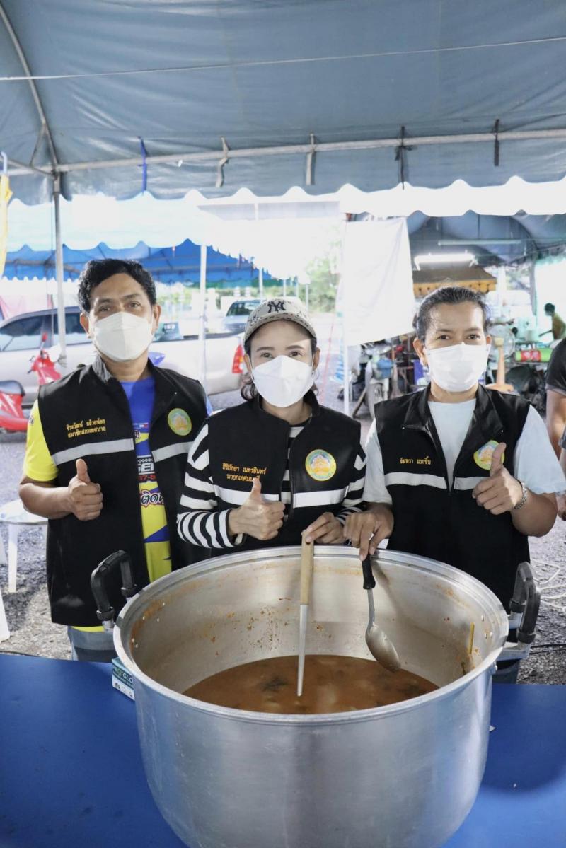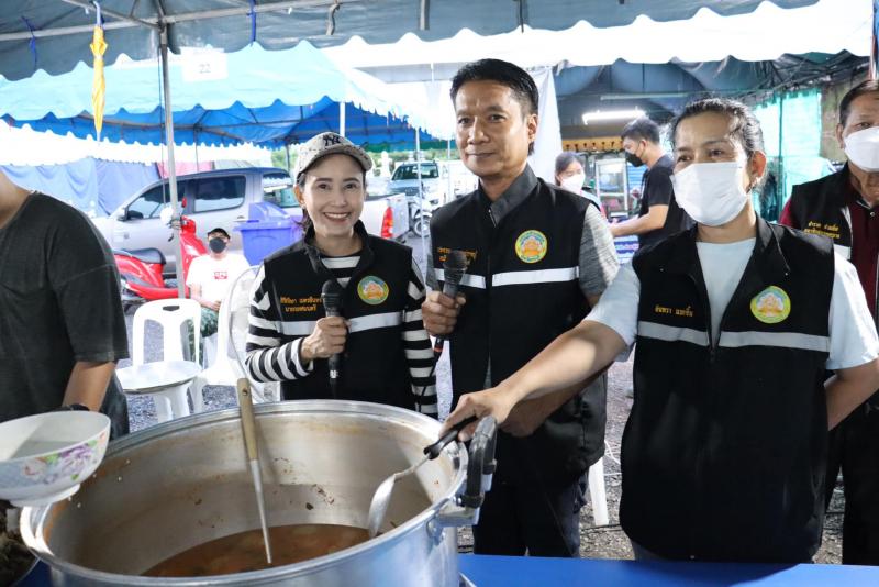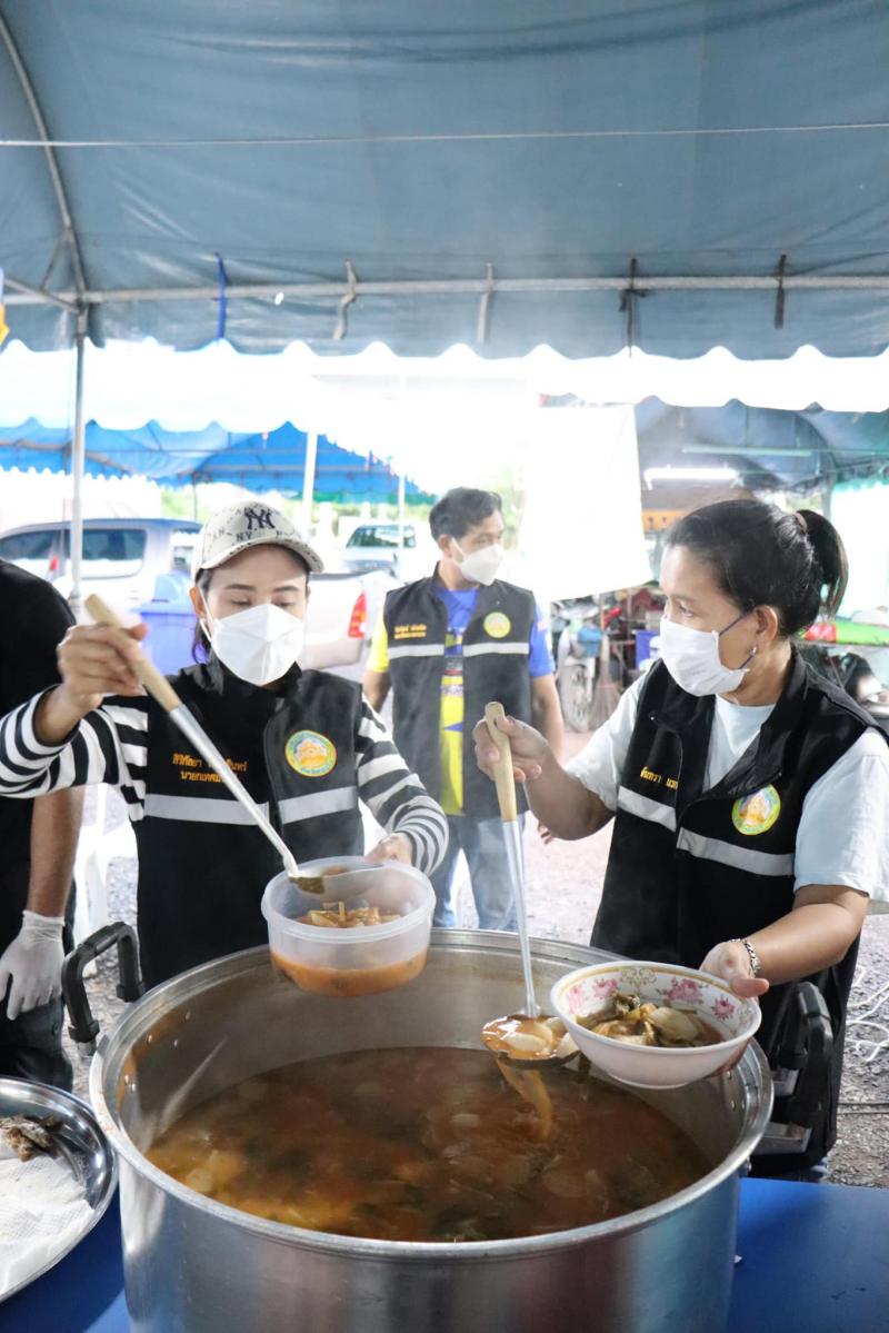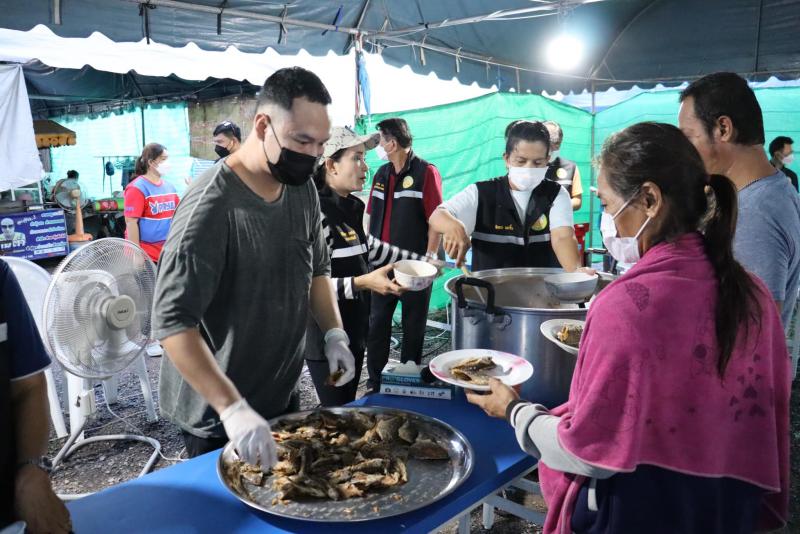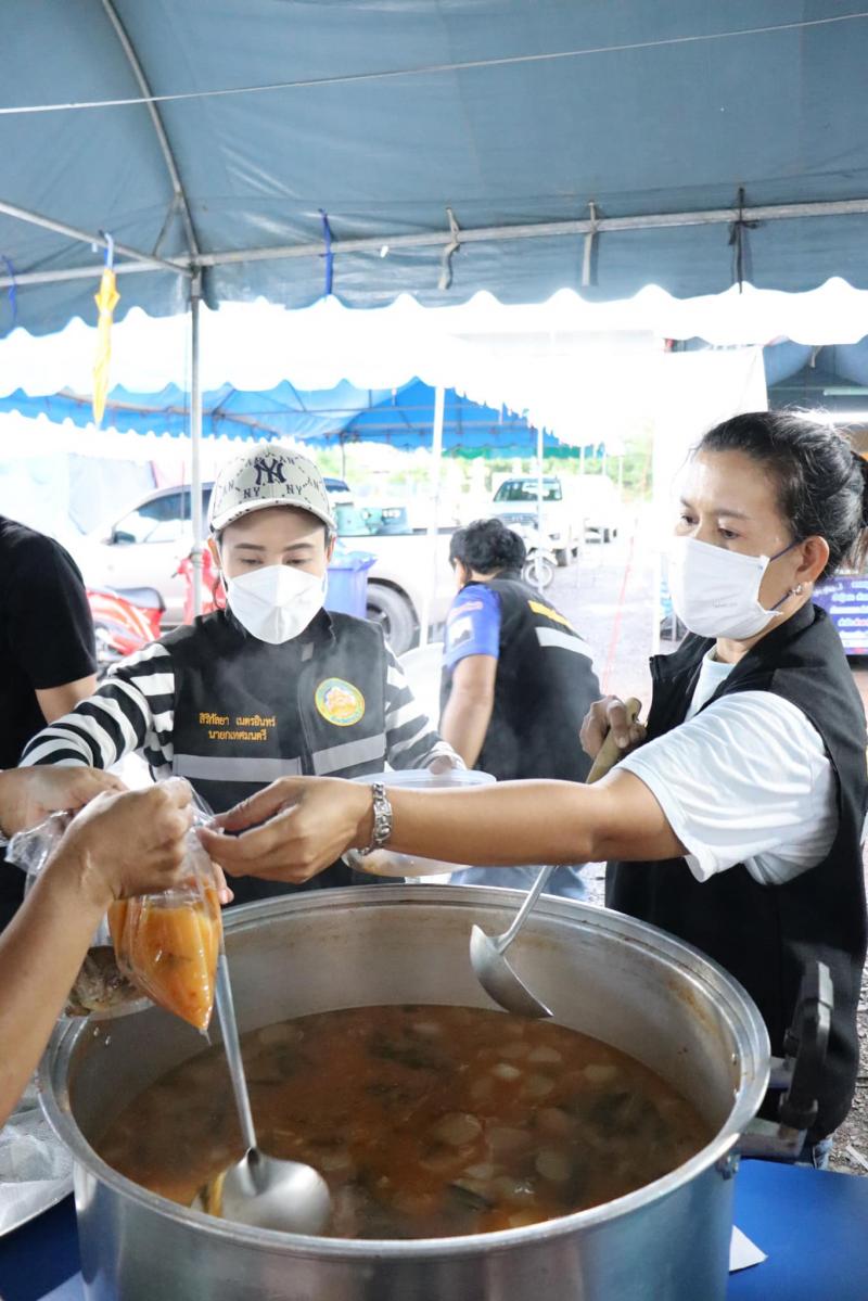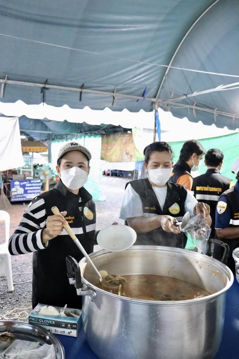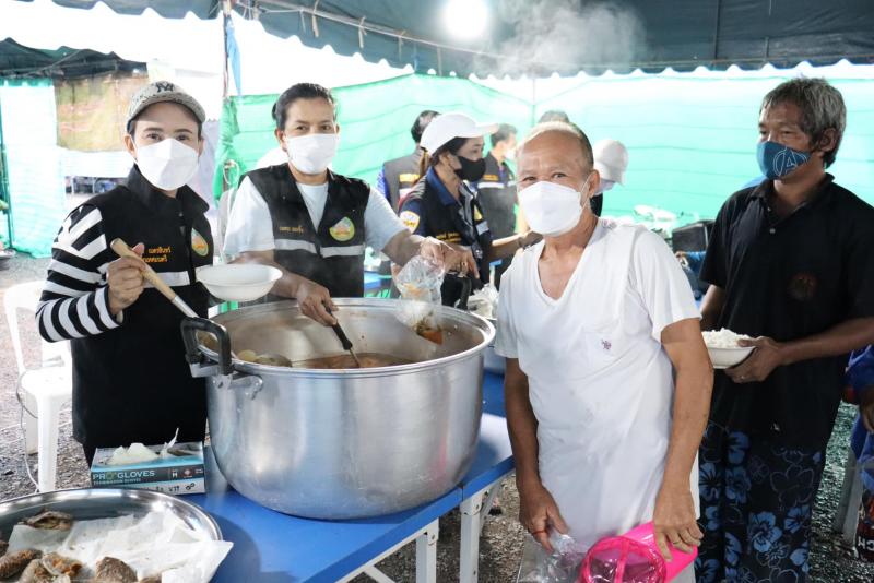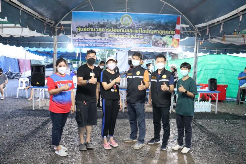นายกแจกจ่ายอาหารสำหรับมื้อเย็นให้ประชาชนที่ได้รับความเดือดร้อนจากอุทกภัย ณ ศูนย์อำนวยการป้องกันและแก้ไขปัญหาอุทกภัย เทศบาลตำบลตะกุด