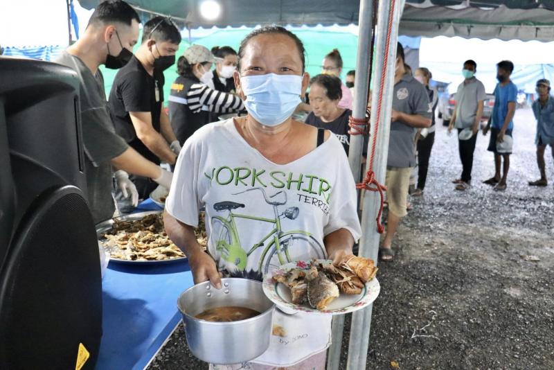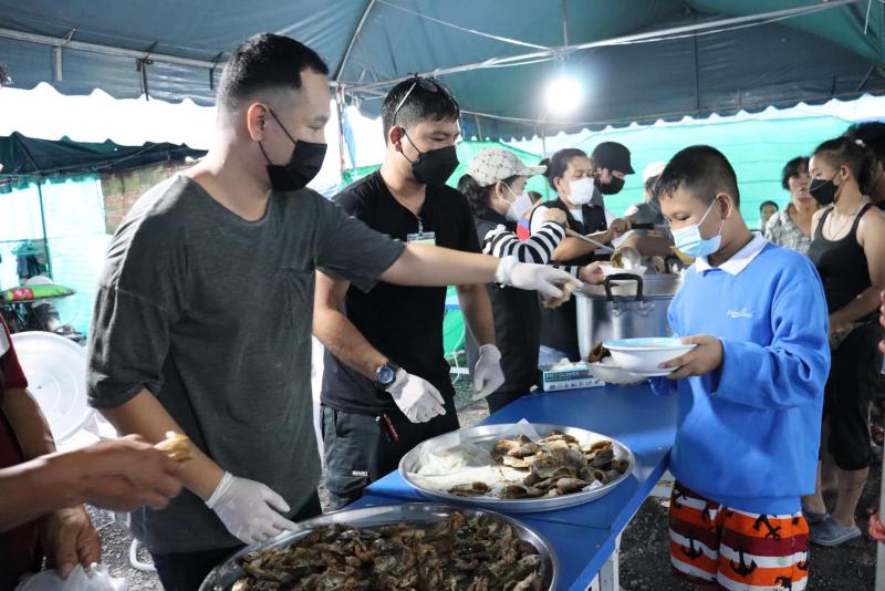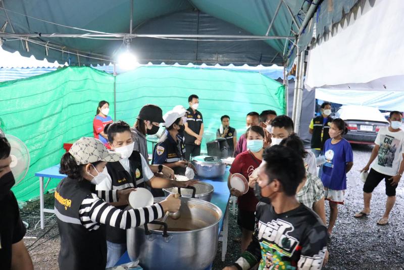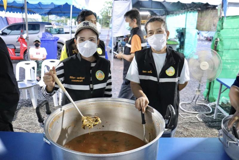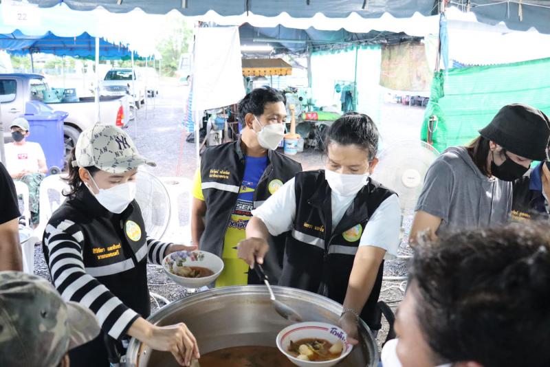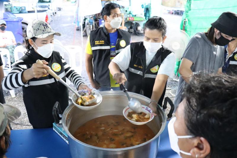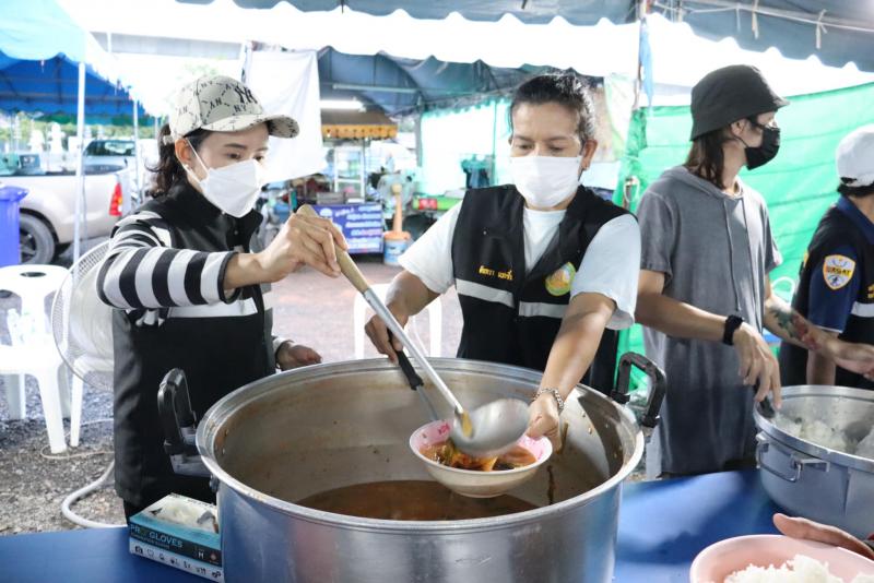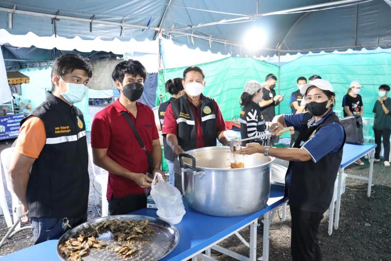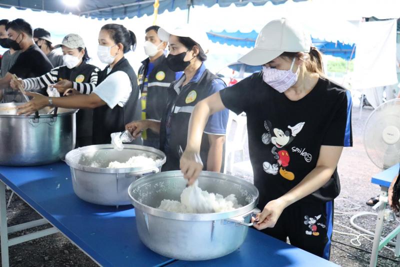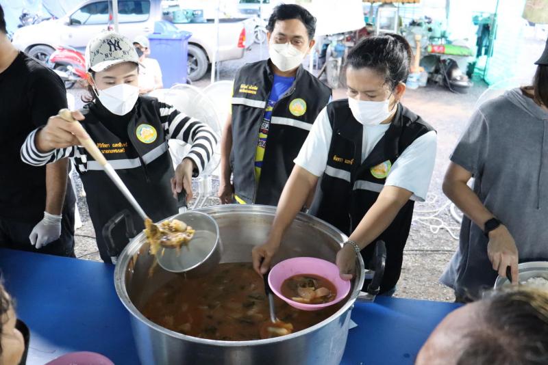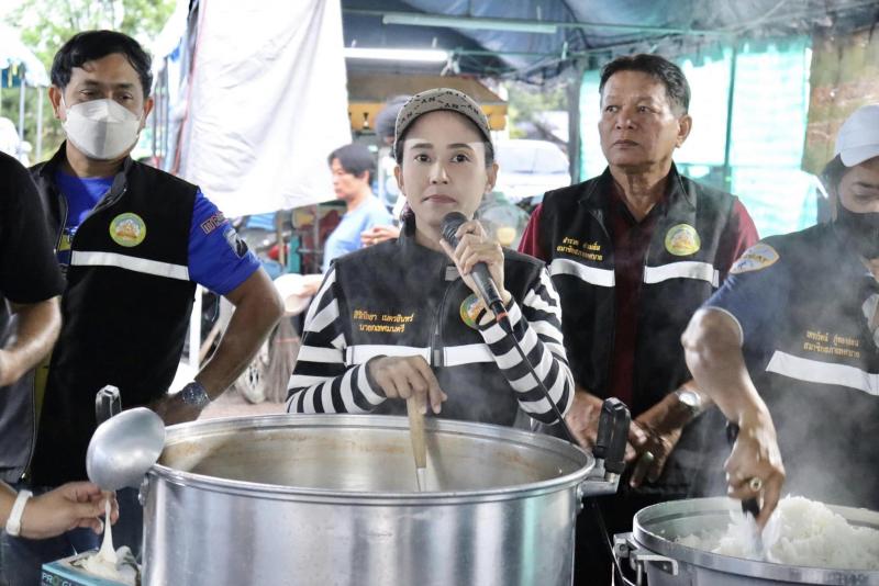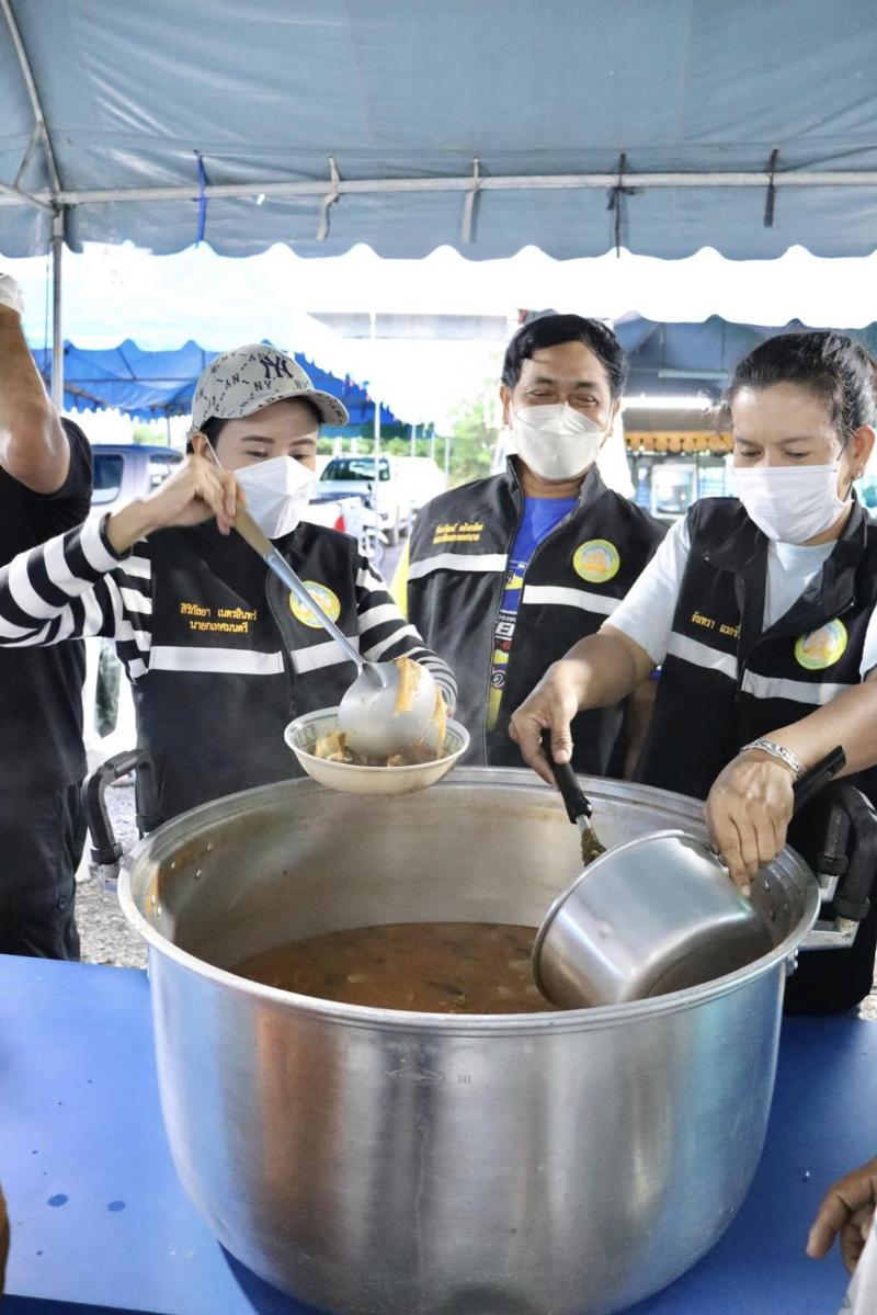 นายกแจกจ่ายอาหารสำหรับมื้อเย็นให้ประชาชนที่ได้รับความเดือดร้อนจากอุทกภัย ณ ศูนย์อำนวยการป้องกันและแก้ไขปัญหาอุทกภัย เทศบาลตำบลตะกุด