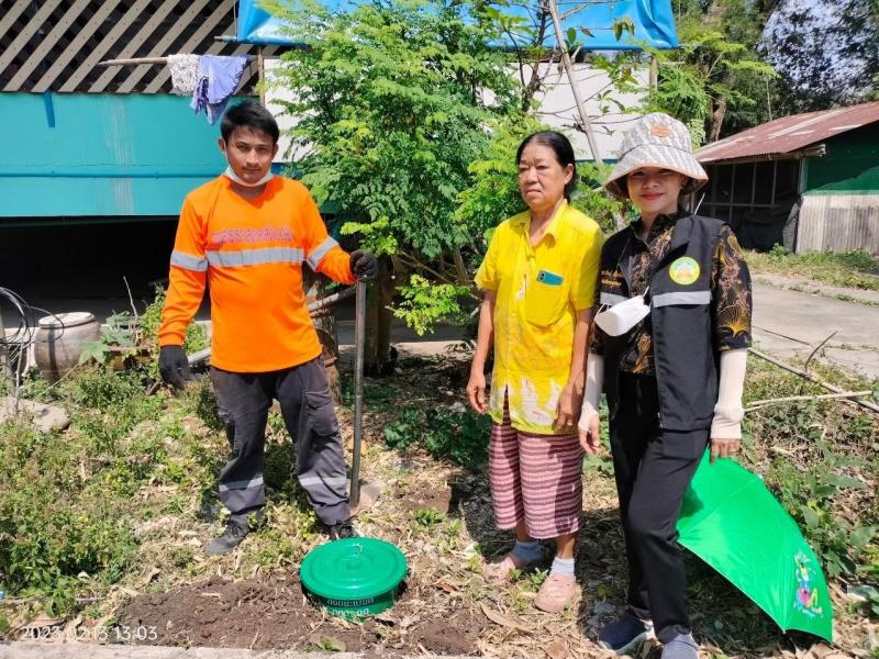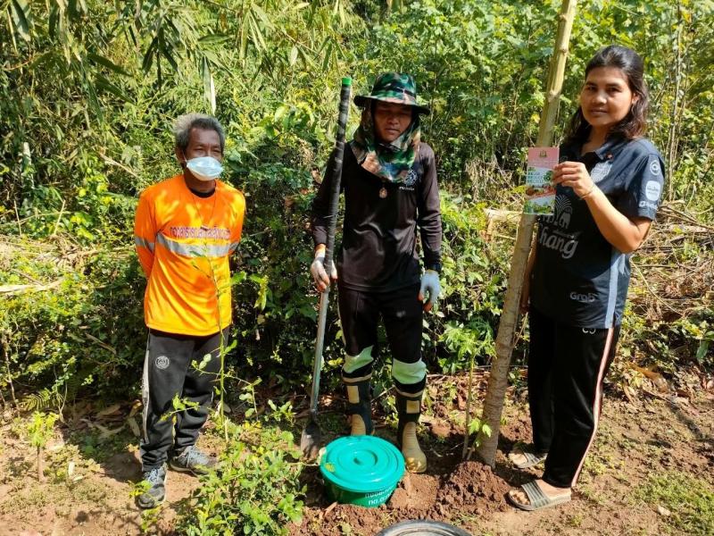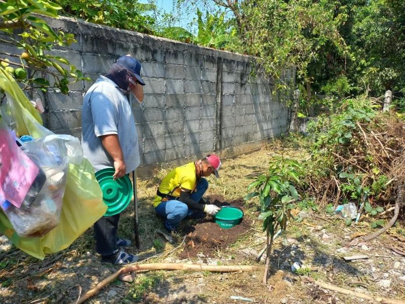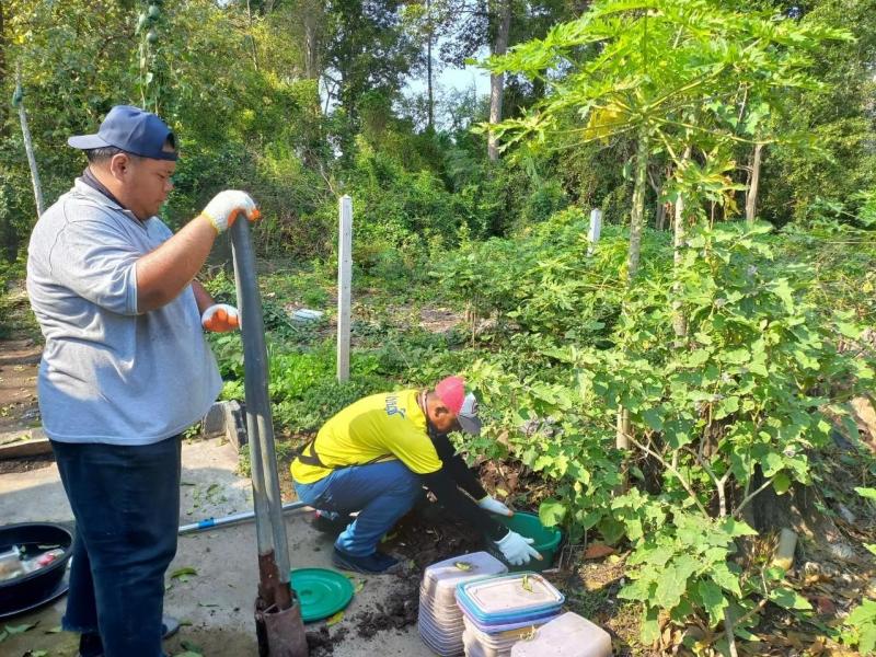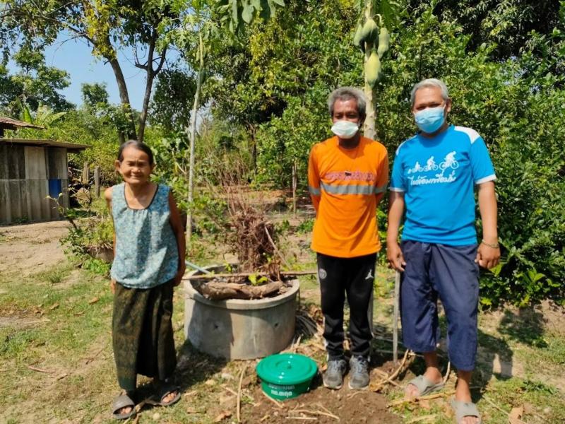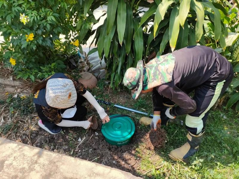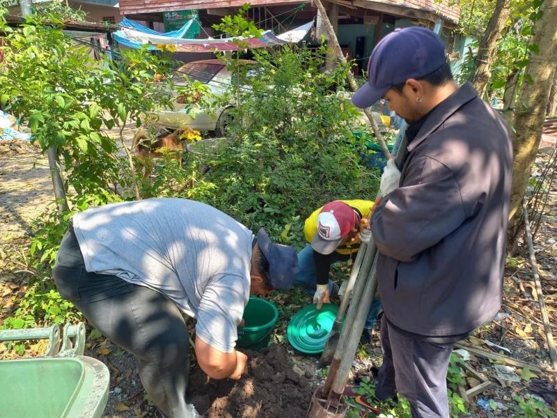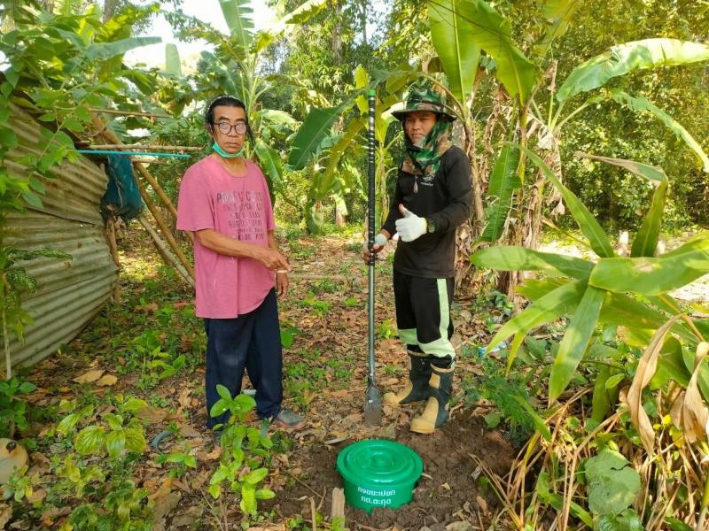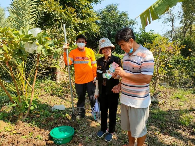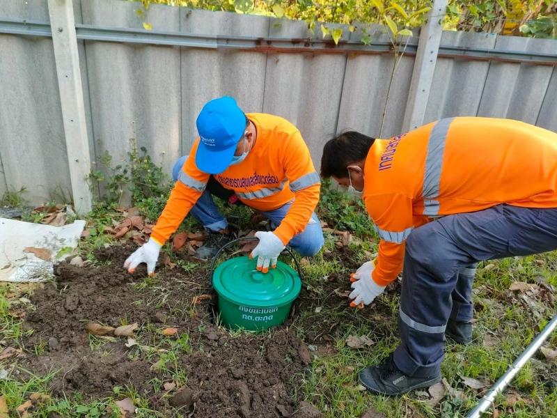 การฝังถังขยะอินทรีย์ (ถังขยะเปียกในครัวเรือน) ตามโครงการลดและคัดแยกขยะมูลฝอยจากต้นทาง ตามหลักการ 3Rs ลงพื้นที่ หมู่ที่ 1 และหมู่ที่ 2