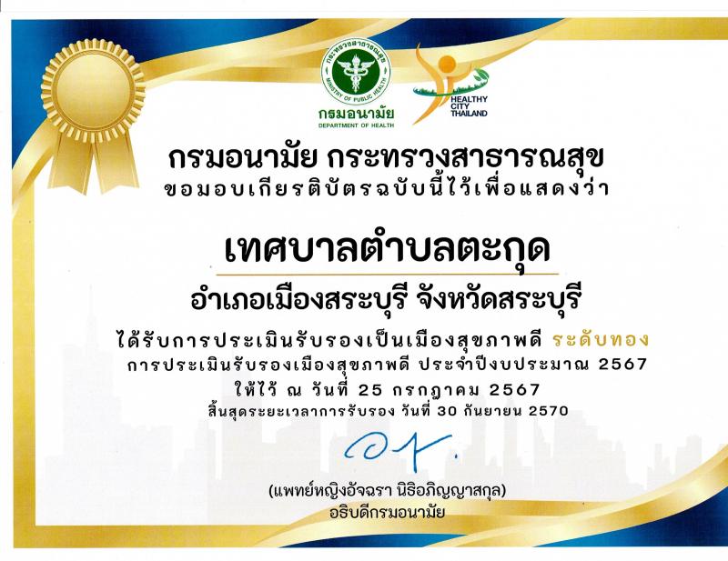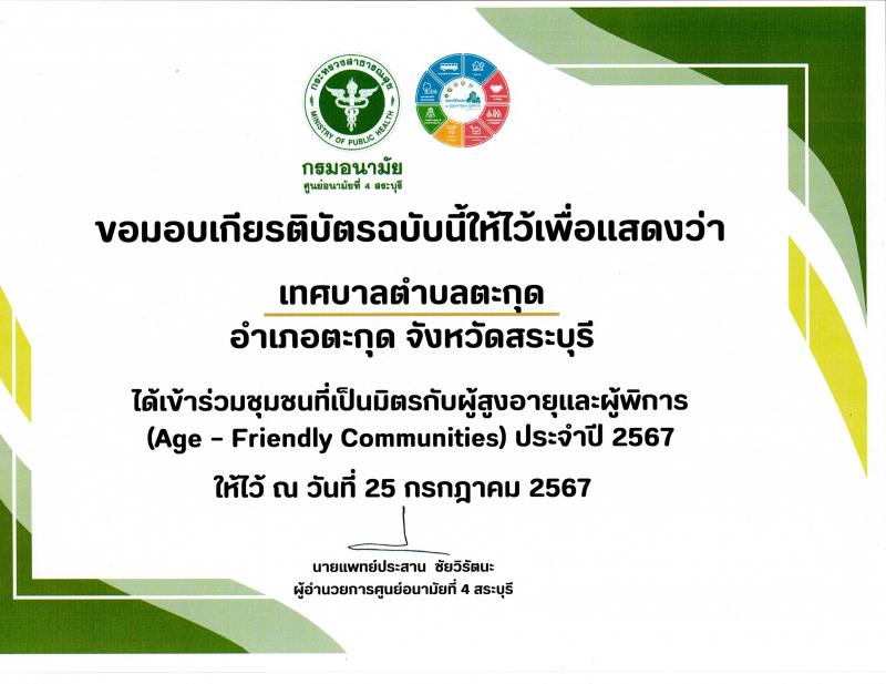 รายละเอียด : วันพฤหัสบดีที่ 25 กรกฎาคม 2567 นางสาวสิริกัลยา เนตรอินทร์ นายกเทศมนตรีตำบลตะกุด มอบหมายให้นางมัชฌิมา ศรีแสง หัวหน้าสำนักปลัดเทศบาลและนางมาลินี บำรุงญาติ นักพัฒนาชุมชนชำนาญการ เป็นตัวแทนเข้ารับมอบเกียรติบัตร “รางวัลชุมชนที่เป็นมิตรกับผู้สูงอายุและผู้พิการ (Age-Friendly communities)” และ ”รางวัลเมืองสุขภาพดี ระดับทอง" โดยศูนย์อนามัยที่ 4 สระบุรี ณ โรงแรมเอเชีย แอร์พอร์ตดอนเมือง จังหวัดปทุมธานี การรับรางวัลในครั้งนี้สะท้อนให้เห็นถึงการที่เทศบาลตำบลตะกุดให้ความสำคัญของพัฒนาสภาพแวดล้อมในชุมชนเมืองที่เป็นมิตรต่อสุขภาพซึ่งเป็นไปตามแนวทางขององค์การอนามัยโลก อีกทั้งยังมุ่งเน้นพัฒนาคุณภาพระบบบริการอนามัยสิ่งแวดล้อม มุ่งสู่ชุมชนน่าอยู่ เมืองน่าอยู่อย่างยั่งยืน