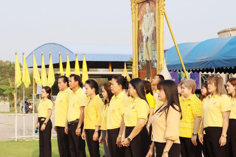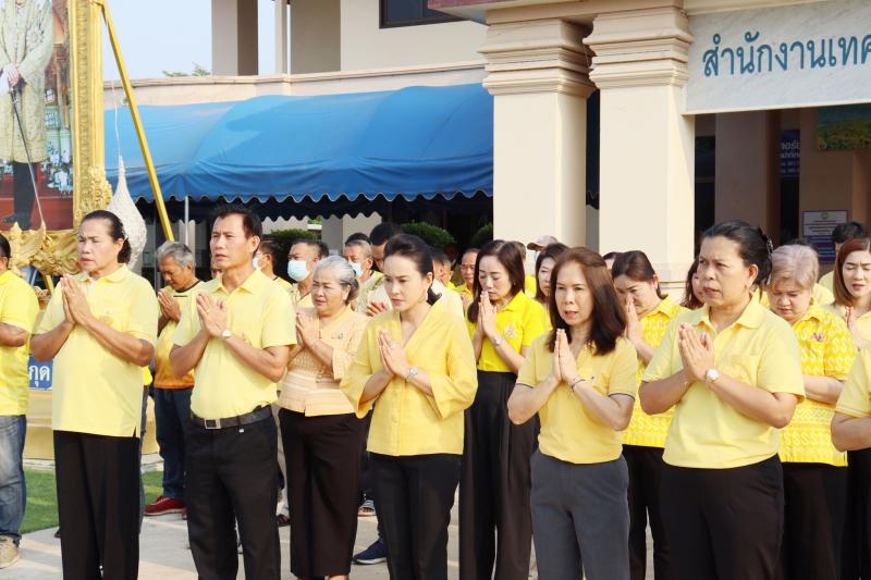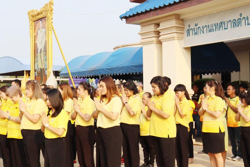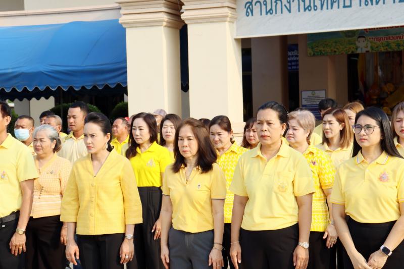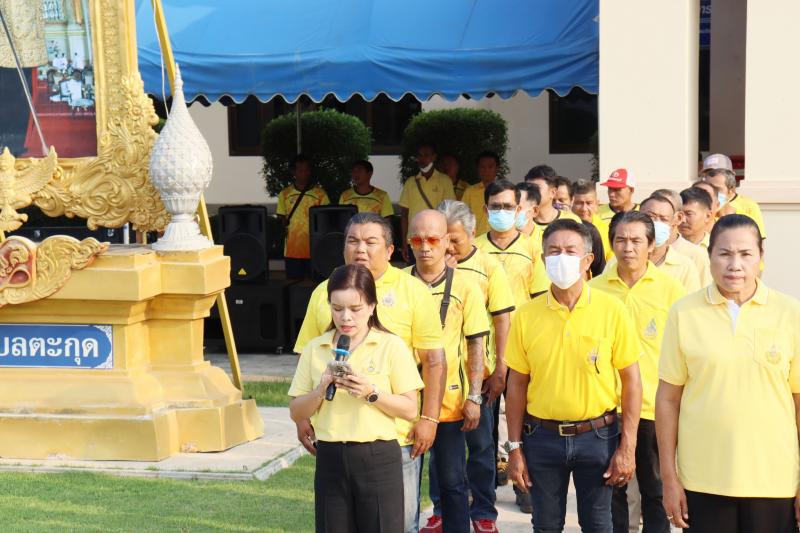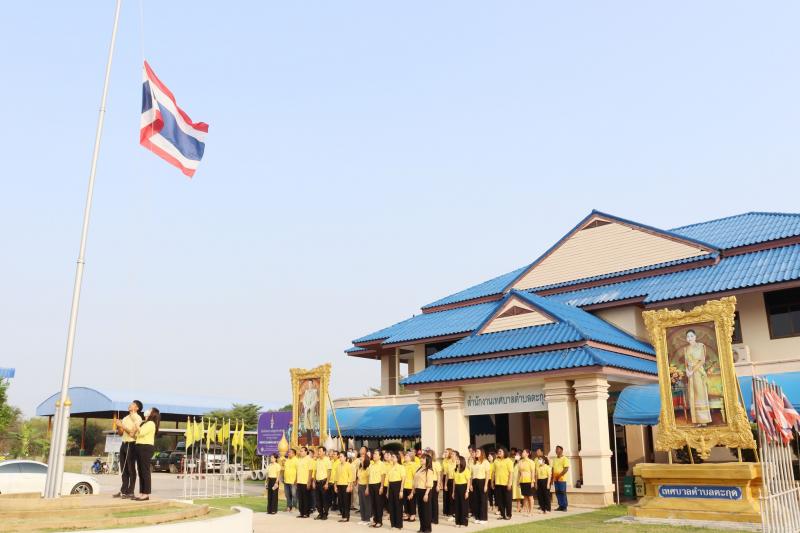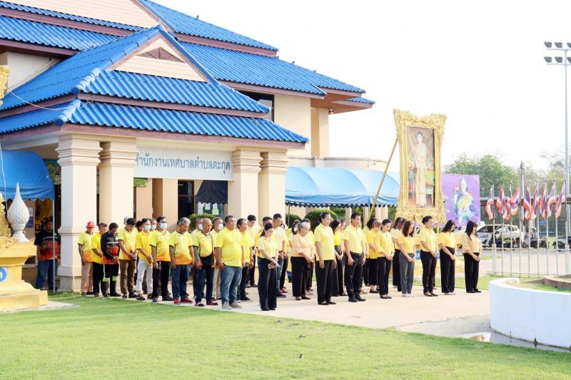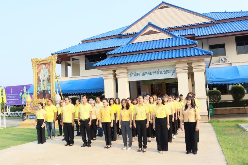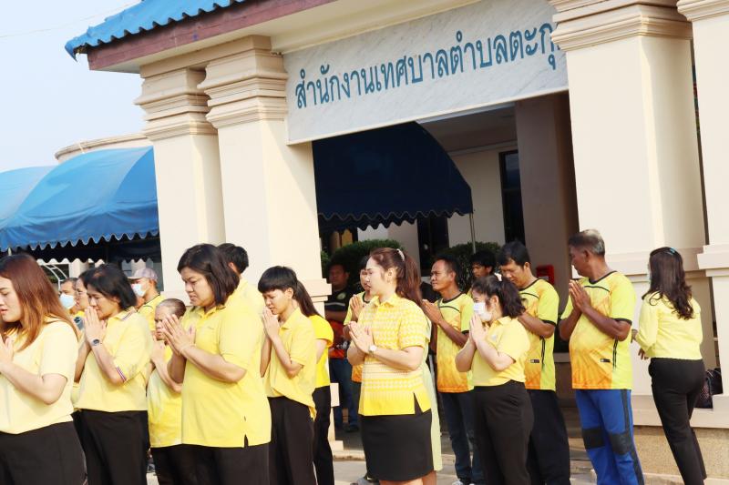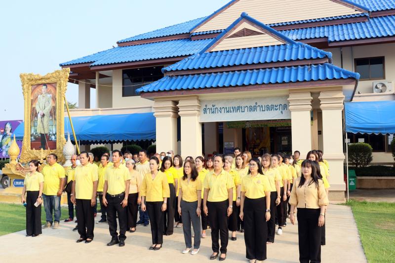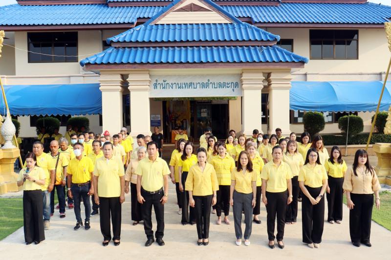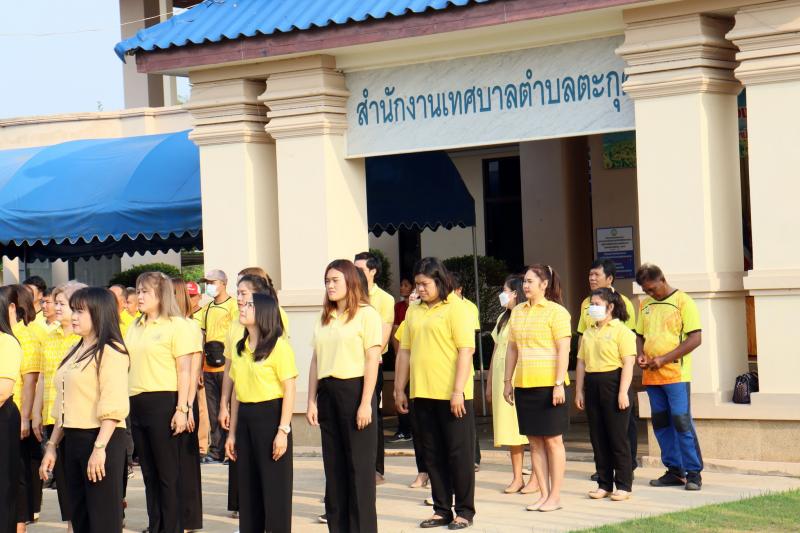 เข้าแถวเคารพธงชาติ สวดมนต์ไหว้พระ และกล่าวคำปฏิญาณตน โดยพร้อมเพรียงกัน บริเวณเสาธงหน้าอาคารสำนักงานเทศบาลตำบลตะกุด