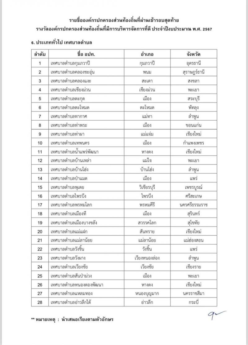 การประเมินเชิงลึก (รอบสุดท้าย) เพื่อประเมินรางวัลองค์กรปกครองส่วนท้องถิ่นที่มีการบริหารจัดการที่ดี ประจำปีงบประมาณ พ.ศ. 2567 ประเภททั่วไป เทศบาลตำบล