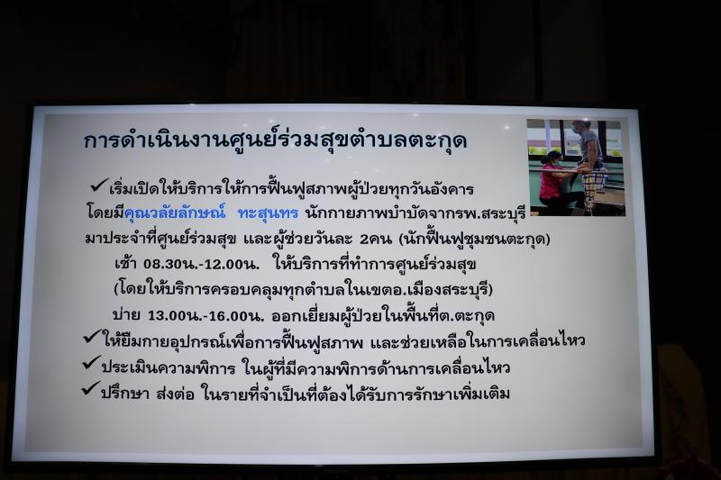 นางสาวสิริกัลยา เนตรอินทร์ นายกเทศมนตรีตำบลตะกุด พร้อมด้วย คณะผู้บริหารฯ ประธานสภาฯและสมาชิกฯ เจ้าหน้าที่กองสาธารณสุขฯ รวมถึง เจ้าหน้าที่สาธารณสุขของโรงพยาบาลส่งเสริมสุขภาพตำบลตะกุด ผู้นำชุมชน อาสาสมัครสาธารณสุขตำบลตะกุด คณะครูและนักเรียนโรงเรียนวัดบ้านกล้วย ร่วมกันต้อนรับ คณะศึกษาดูงาน กองทุนฟื้นฟูสมรรถภาพที่จำเป็นต่อสุขภาพจังหวัดระยอง ภายใต้การดำเนินงานขององค์การบริหารส่วนจังหวัดระยอง เพื่อเข้าศึกษาดูงานกองทุนฟื้นฟูสมรรถภาพที่จำเป็นต่อสุขภาพจังหวัดสระบุรี และร่วมแลกเปลี่ยนเรียนรู้การดำเนินงานและการบริหารจัดการศูนย์ร่วมสุขชุมชนต้นแบบตำบลตะกุด ซึ่งมีนายกเทศมนตรีตำบลตะกุดเป็นประธานคณะกรรมการศูนย์ฯ โดยในคณะศึกษาดูงานประกอบด้วย คณะกรรมการ คณะอนุกรรมการ คณะทำงานและผู้ที่เกี่ยวข้อง รวมจำนวน 100 คน