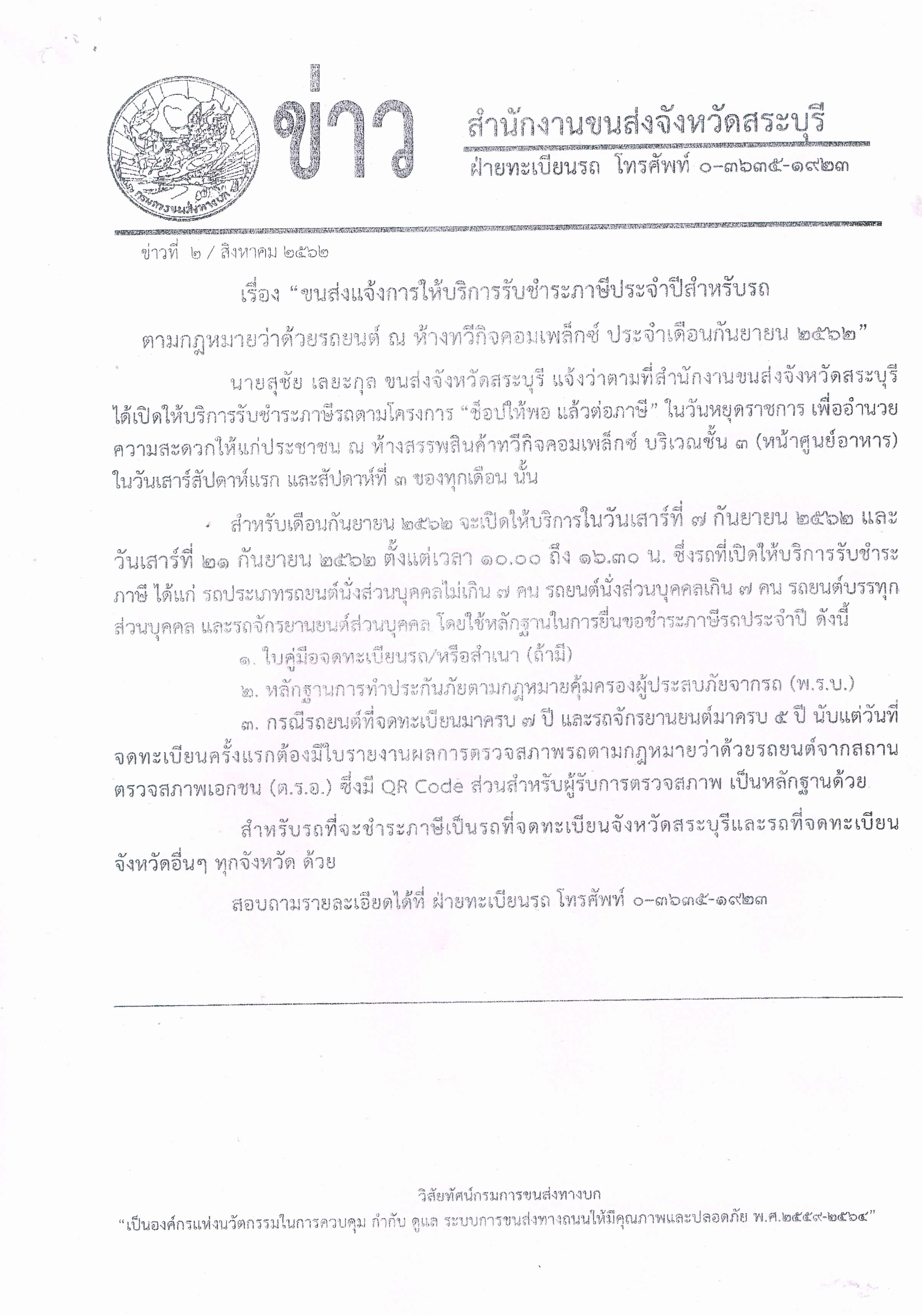 ประชาสัมพันธ์ข่าว เรื่อง “ขนส่งแจ้งการให้บริการรับชำระภาษีประจำปีสำหรับรถตามกฎหมายว่าด้วยรถยนต์ ณ ห้างทวีกิจคอมเพล็กซ์ ประจำเดือนกันยายน 2562”