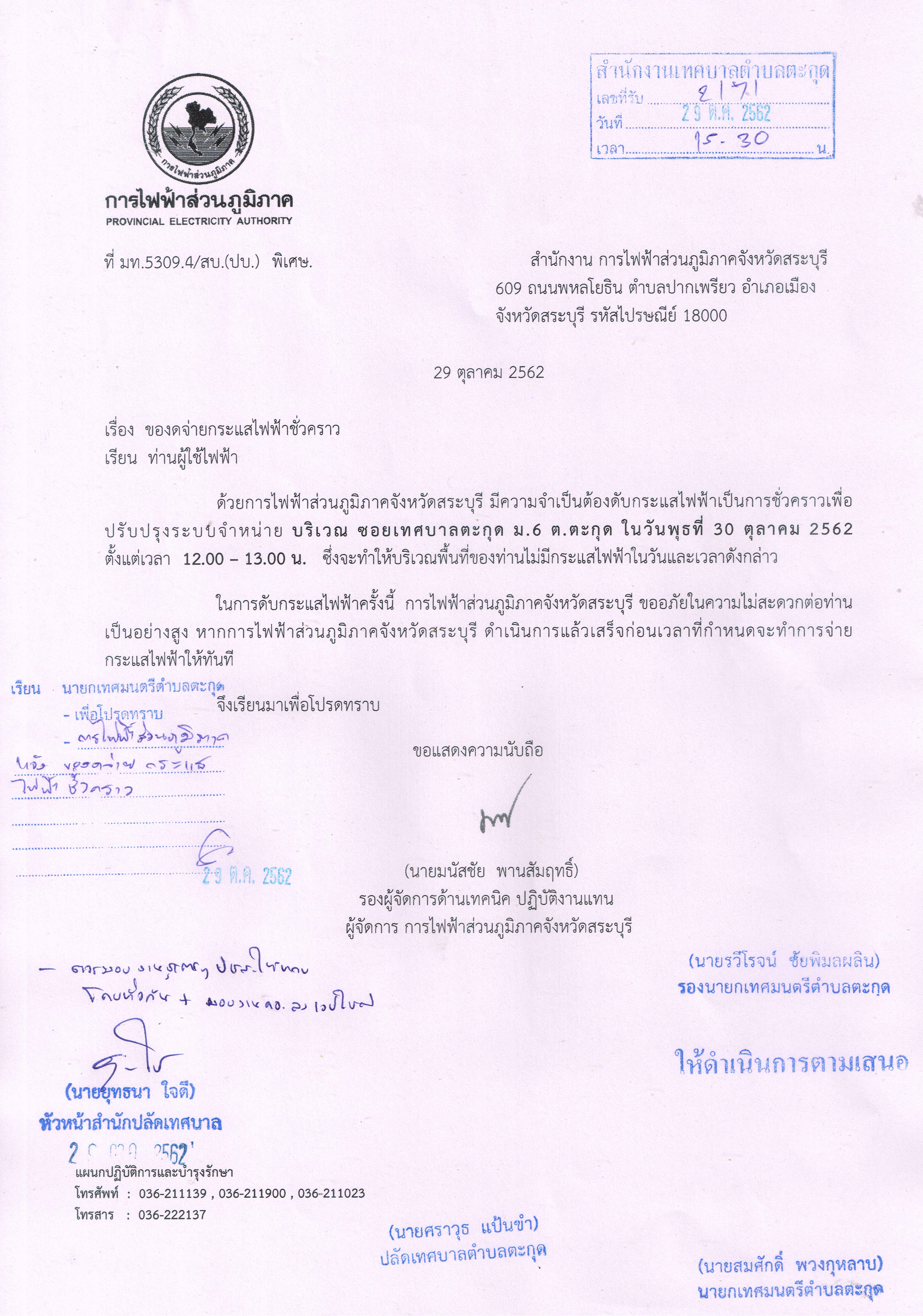 ประชาสัมพันธ์จากการไฟฟ้าส่วนภูมิภาคจังหวัดสระบุรี แจ้งดับกระแสไฟฟ้าเป็นการชั่วคราวเพื่อปรับปรุงระบบจำหน่าย บริเวณ ซอยเทศบาลตำบลตะกุด หมู่ 6 ตำบลตะกุด