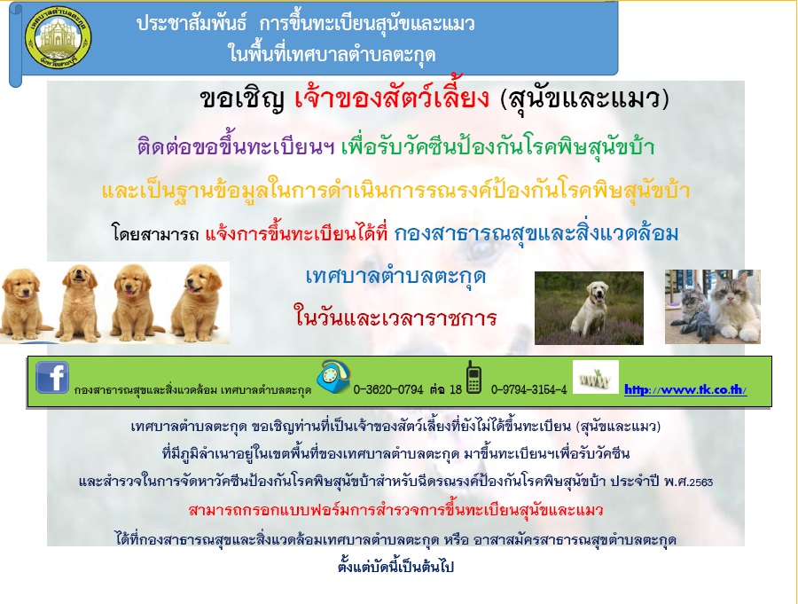 การขึ้นทะเบียนสุนัข และแมว ตามโครงการสัตว์ปลอดโรค คนปลอดภัยจากโรคพิษสุนัขบ้า ประจำปี พ.ศ.2563 เทศบาลตำบลตะกุด ร่วมกับสำนักงานปศุสัตว์อำเภอเมืองสระบุรี