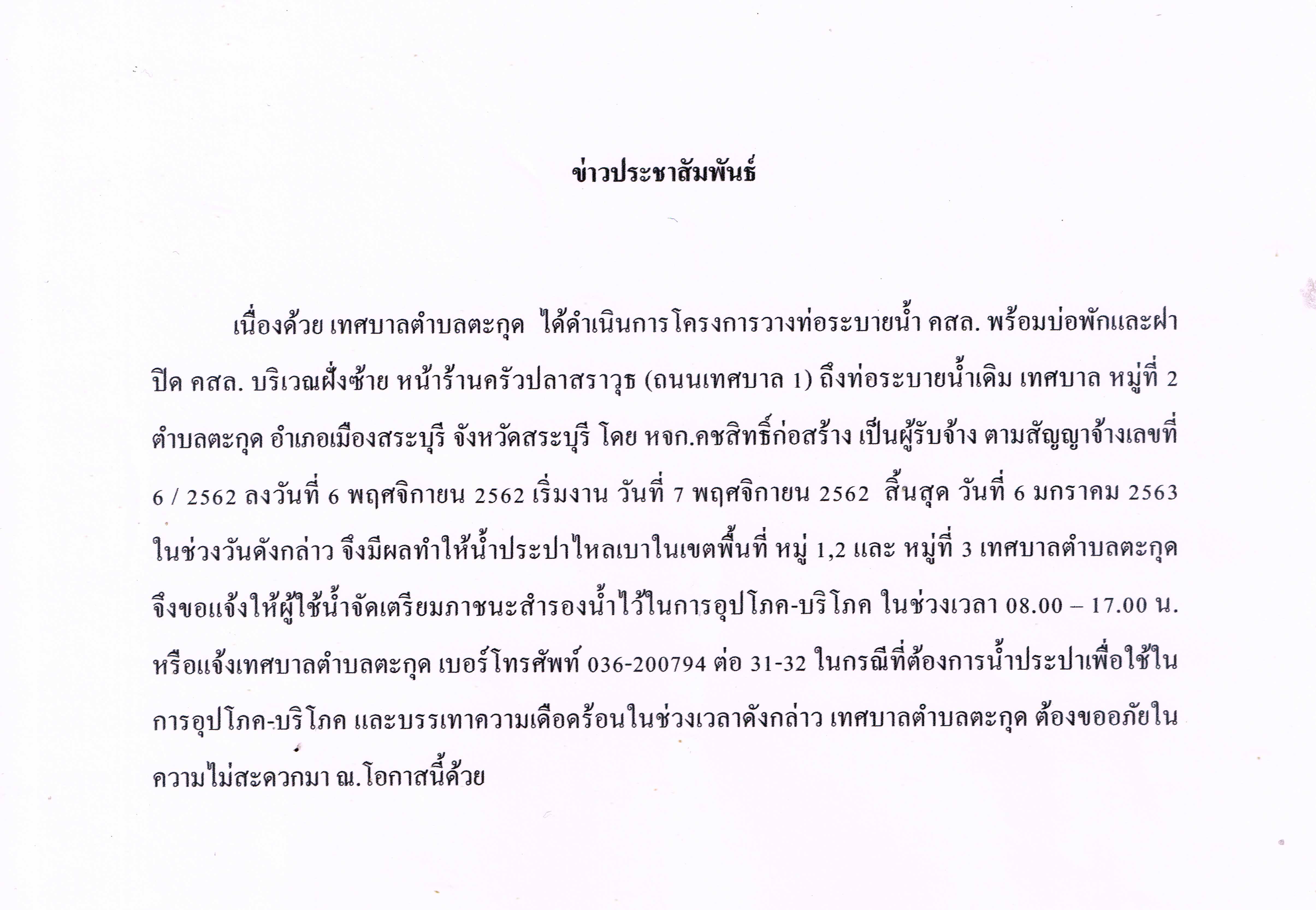 ข่าวประชาสัมพันธ์ เนื่องด้วย เทศบาลตำบลตะกุด ได้ดำเนินการโครงการวางท่อระบายน้ำ คสล. พร้อมบ่อพักและฝาปิด คสล. บริเวณฝั่งซ้าย หน้าร้านครัวปลาสราวุธ (ถ