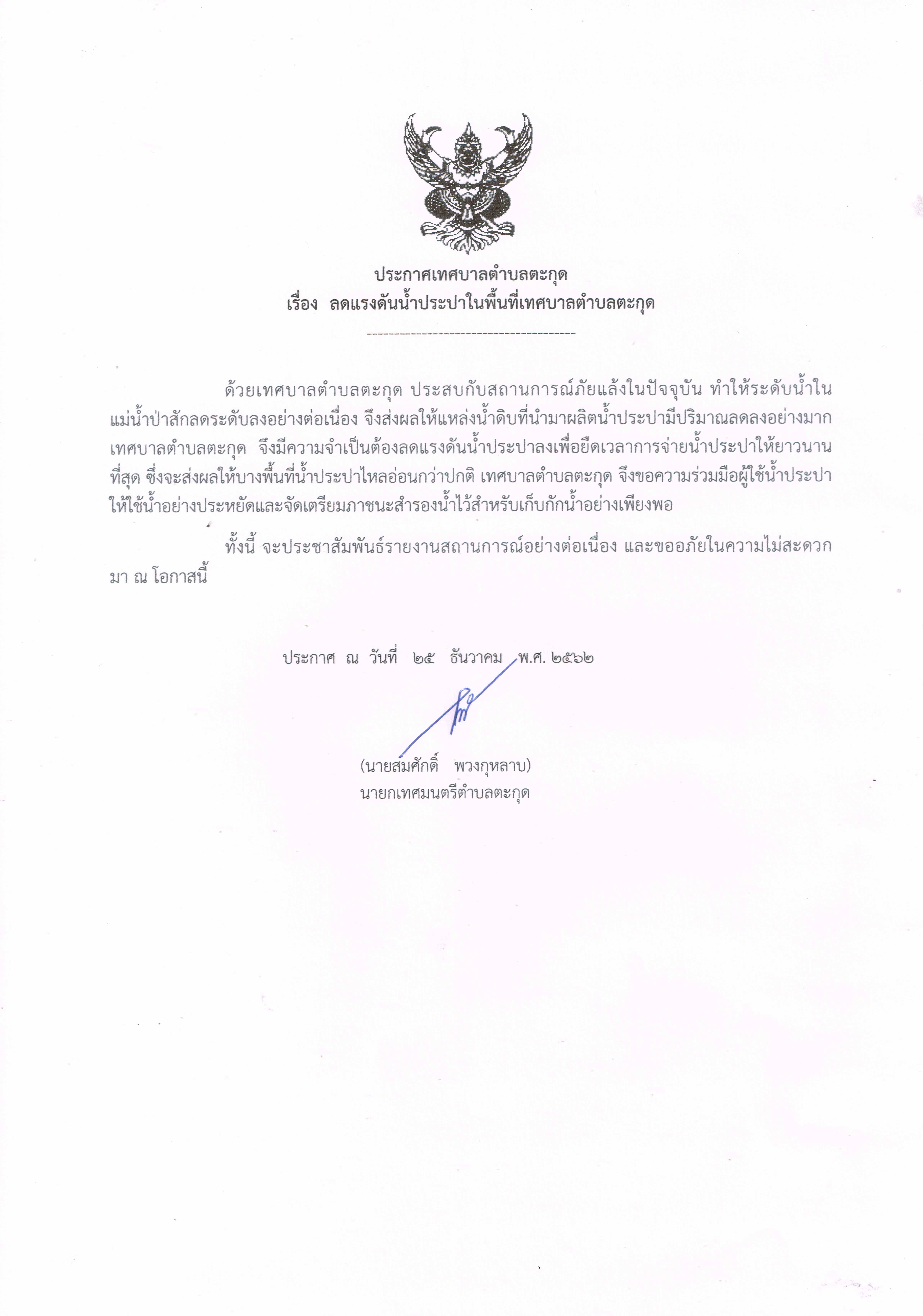 ประกาศเทศบาลตำบลตะกุด เรื่อง ลดแรงดันน้ำประปาในพื้นที่เทศบาลตำบลตะกุด