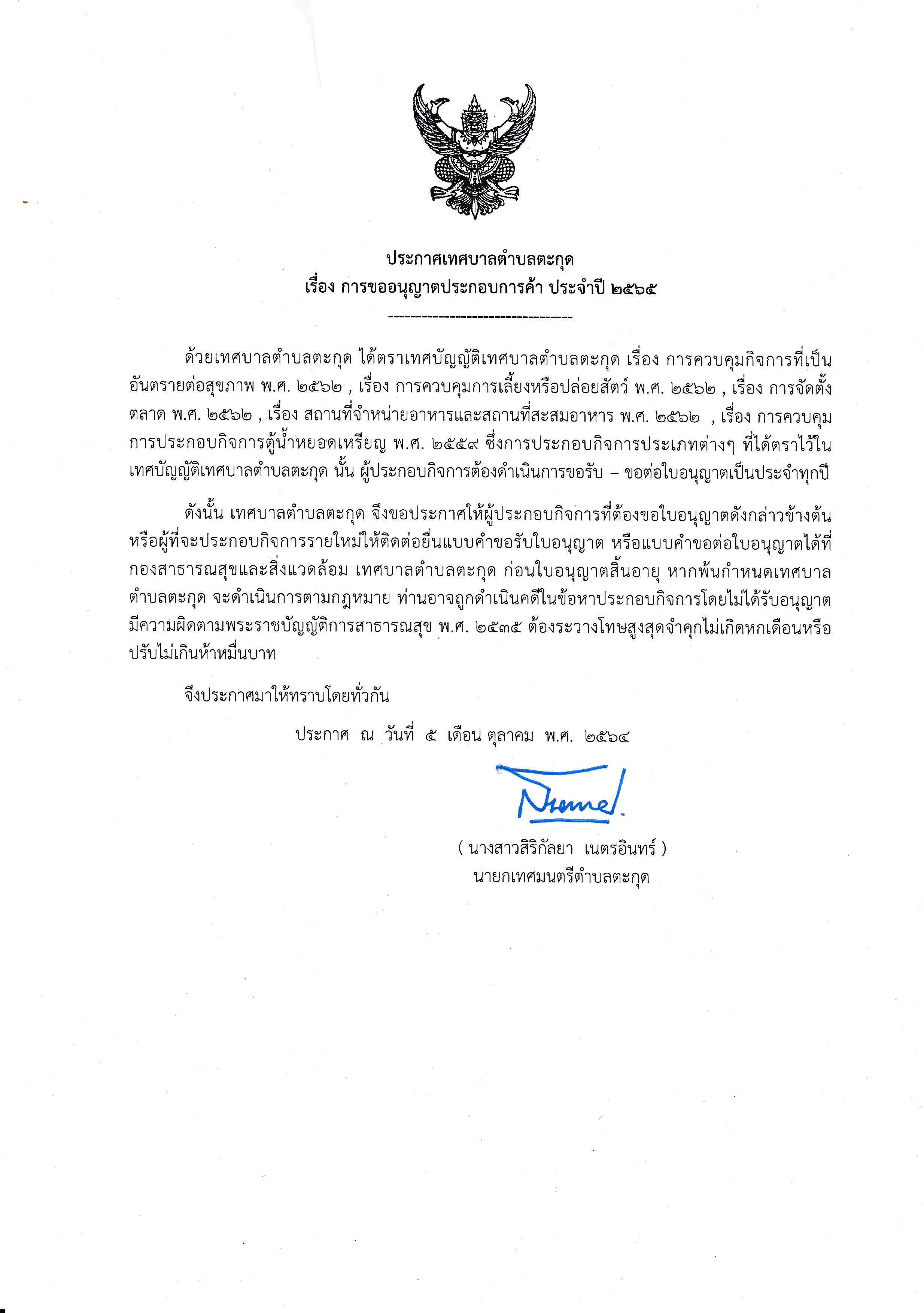 ประชาสัมพันธ์ จาก เทศบาลตำบลตะกุด เรื่อง การขออนุญาตประกอบการค้า ประจำปี ๒๕๖๕