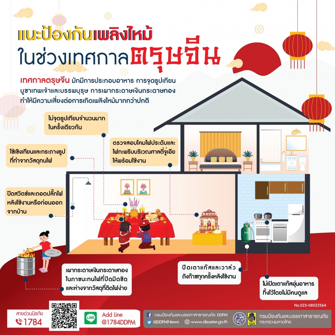ธูปเทียนให้สนิททุกครั้ง เผากระดาษเงิน กระดาษทองในภาชนะที่ปิดมิดชิด ไม่ควรจุดประทัดในพื้นที่เสี่ยงเพลิงไหม้และเสี่ยงอันตราย