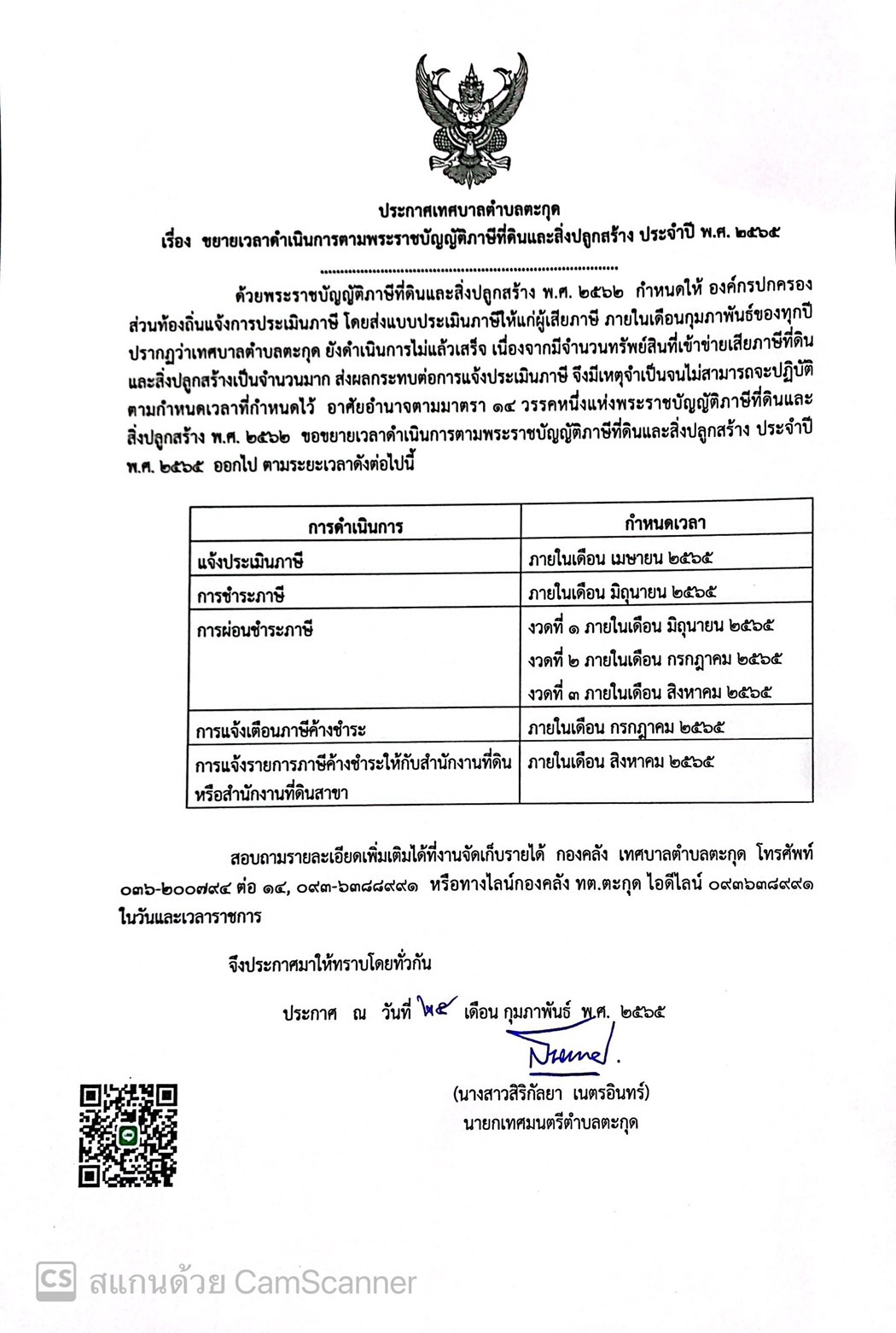 ประกาศ เทศบาลตำบลตะกุด ขยายเวลาดำเนินการตามพระราชบัญญัติภาษีที่ดินและสิ่งปลูกสร้าง ประจำปี พ.ศ. 2565