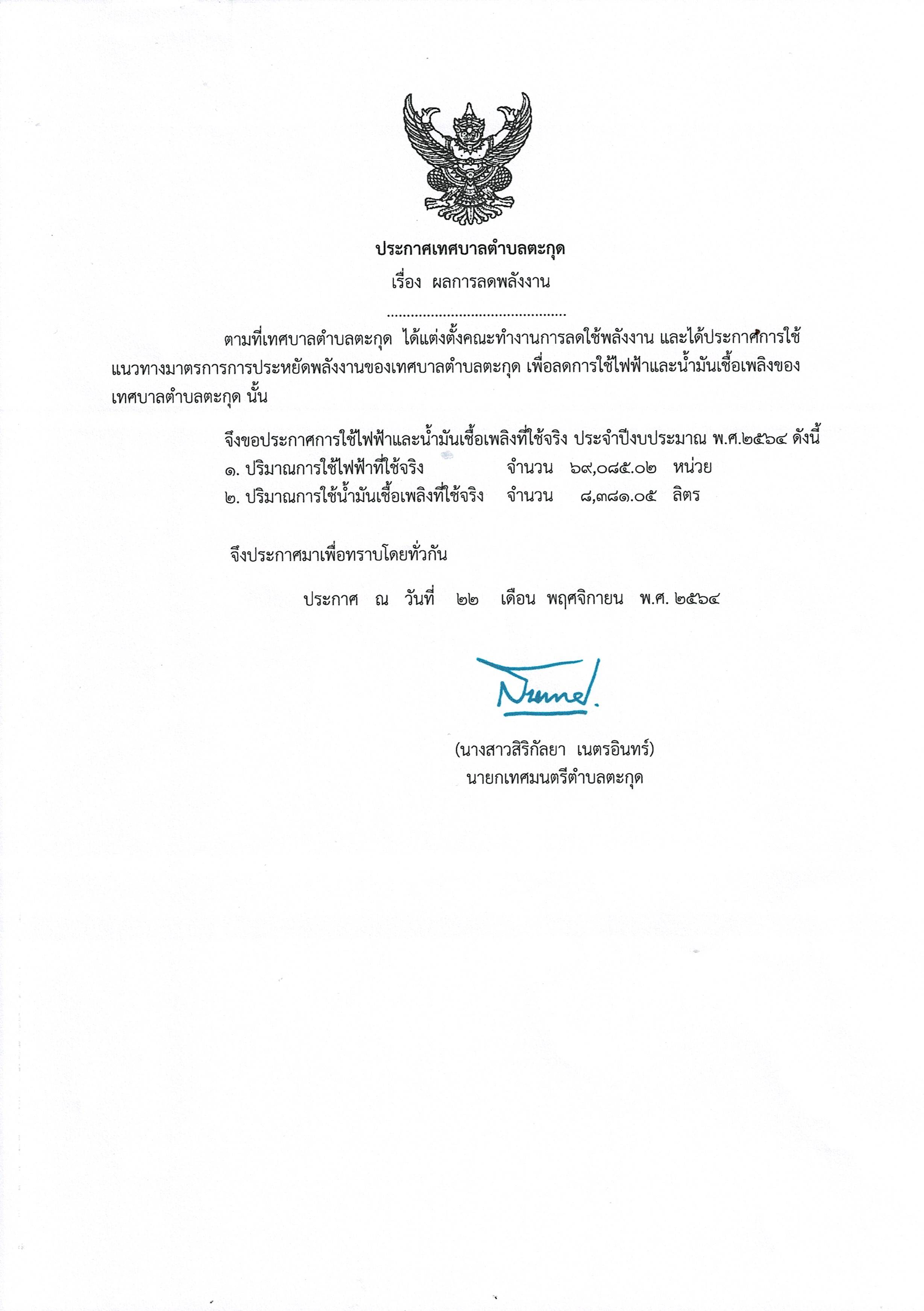 ประกาศเทศบาลตำบลตะกุด เรื่อง ผลการลดพลังงาน