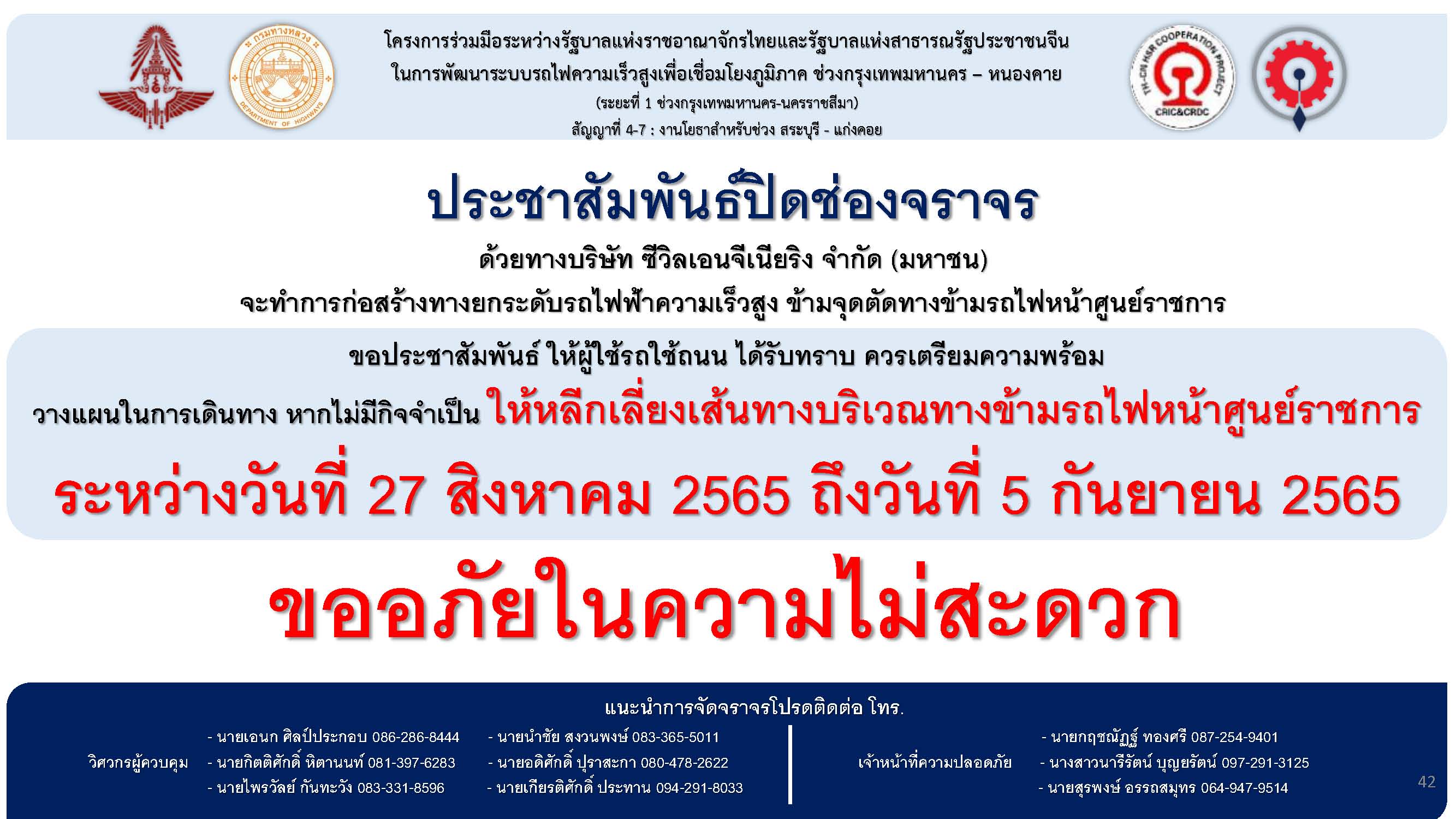 ด้วย บริษัท ซิวิลเอนจีเนียริง จำกัด (มหาชน) จะทำการก่อสร้างทางยกระดับรถไฟฟ้าความเร็วสูง ข้ามจุดตัดทางข้ามรถไฟหน้าศูนย์ราชการ จึงขอแจ้งให้ผู้ใช้รถใช้ถนน ได้รับทราบ และวางแผนในการใช้เส้นทางดังกล่าว หากไม่มีกิจจำเป็น ให้หลีกเลี่ยงเส้นทางบริเวณทางข้ามรถไฟหน้าศูนย์ราชการจังหวัดสระบุรี ระหว่างวันที่ 27 สิงหาคม 2565 ถึงวันที่ 5 กันยายน 2565 (เป็นเวลา 10 วัน) ต้องขออภัยในความไม่สะดวกมา ณ ที่นี้ด้วยคะ