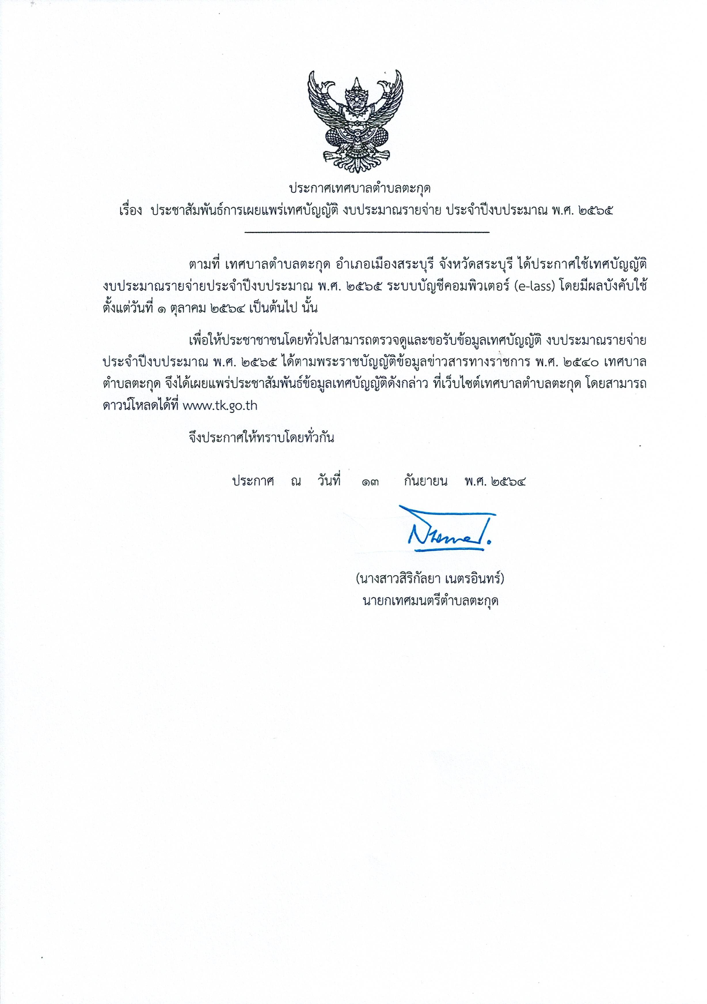 ประกาศเทศบาลตำบลตะกุด เรื่อง ประชาสัมพันธ์การเผยแพร่เทศบัญญัติ งบประมาณรายจ่าย ประจำปีงบประมาณ พ.ศ. 2565