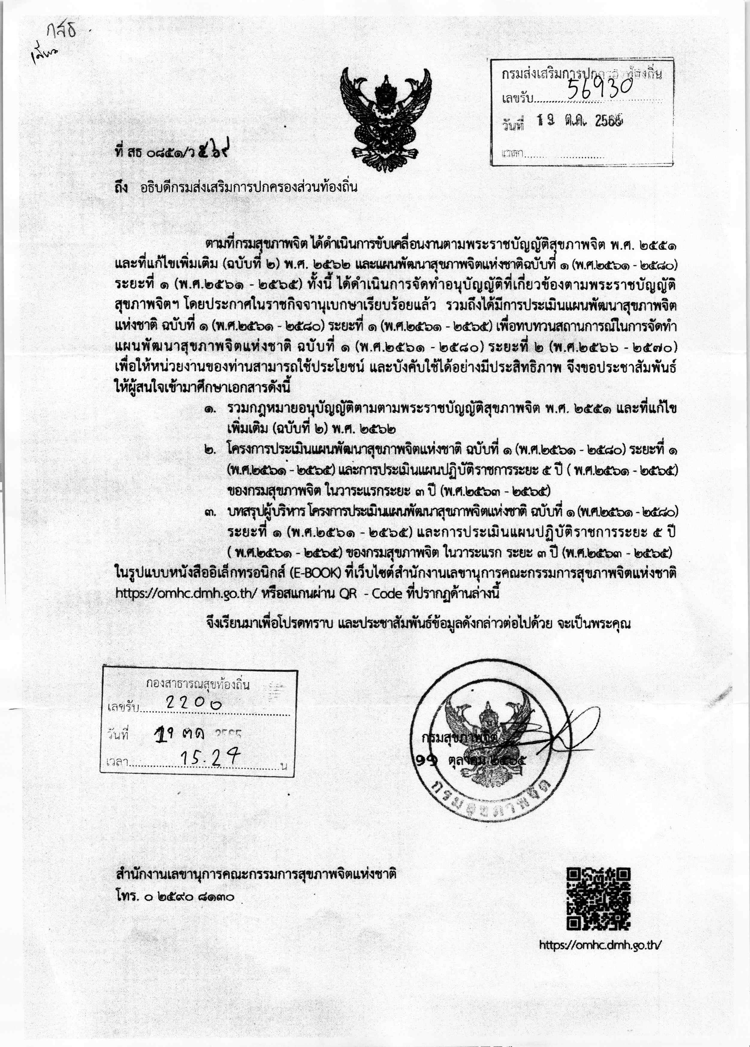 รายละเอียด : ประชาสัมพันธ์ กรมสุขภาพจิตได้ดำเนินการขับเคลื่อนงานตามพระราชบัญญัติสุขภาพจิต พ.ศ. ๒๕๕๑ และที่แก้ไขเพิ่มเติม (ฉบับที่ ๒) พ.ศ. ๒๕๖๒ และแผนพัฒนาสุขภาพจิตแห่งชาติ ฉบับที่ ๑ (พ.ศ. ๒๕๖๑ - ๒๕๘๐) ระยะที่ ๑ (พ.ศ. ๒๕๖๑ - ๒๕๖๕) และได้ดำเนินการจัดทำอนุบัญญัติที่เกี่ยวข้องตามพระราชบัญญัติสุขภาพจิตฯ โดยประกาศในราชกิจจานุเบกษาเรียบร้อยแล้ว รวมถึงได้มีการประเมินแผนพัฒนาสุขภาพจิตแห่งชาติ ฉบับที่ ๑ (พ.ศ. ๒๕๖๑ - ๒๕๗๐)