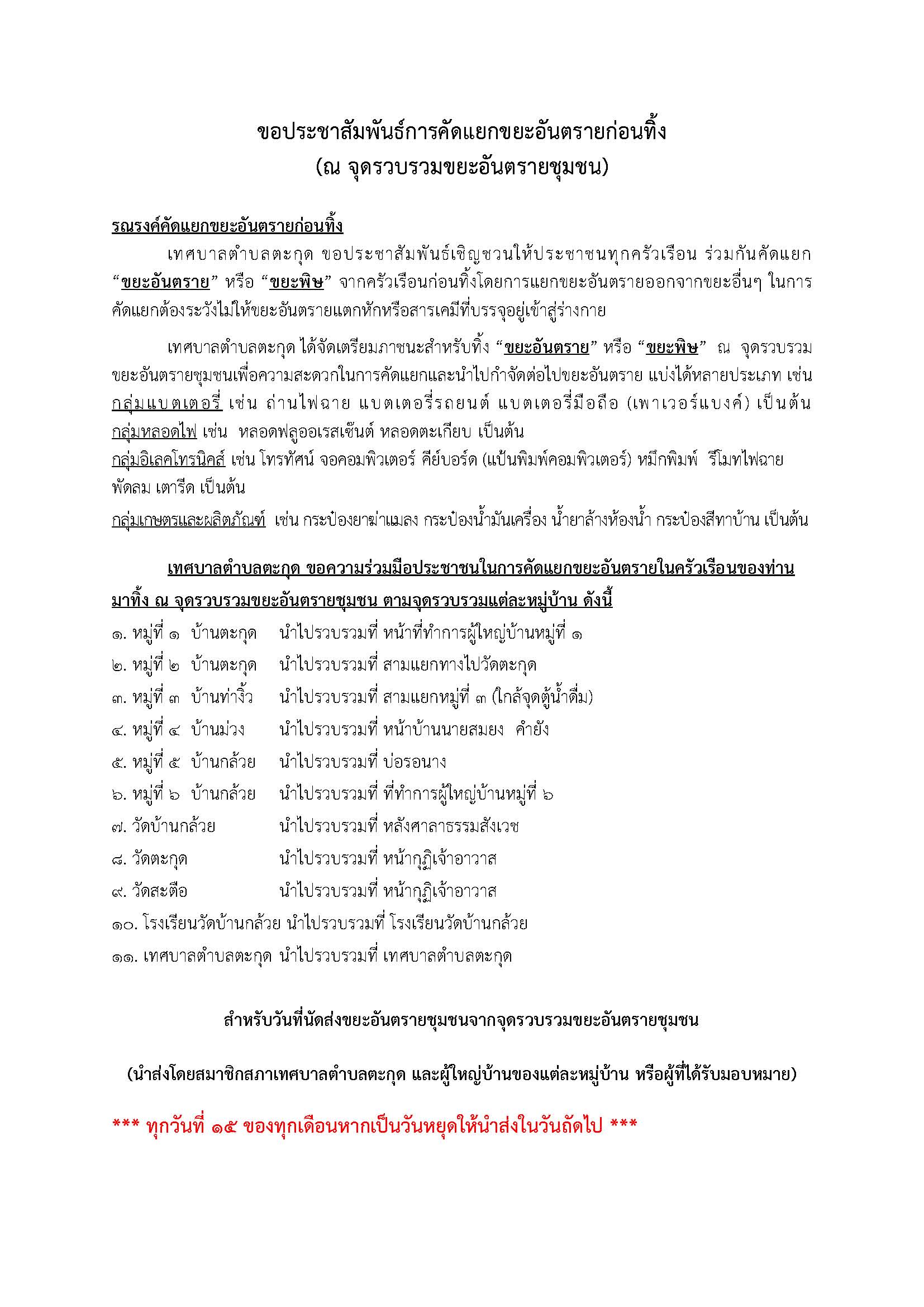 เทศบาลตำบลตะกุด ขอประชาสัมพันธ์การคัดแยกขยะอันตรายก่อนทิ้ง (ณ จุดรวบรวมขยะอันตรายชุมชน)