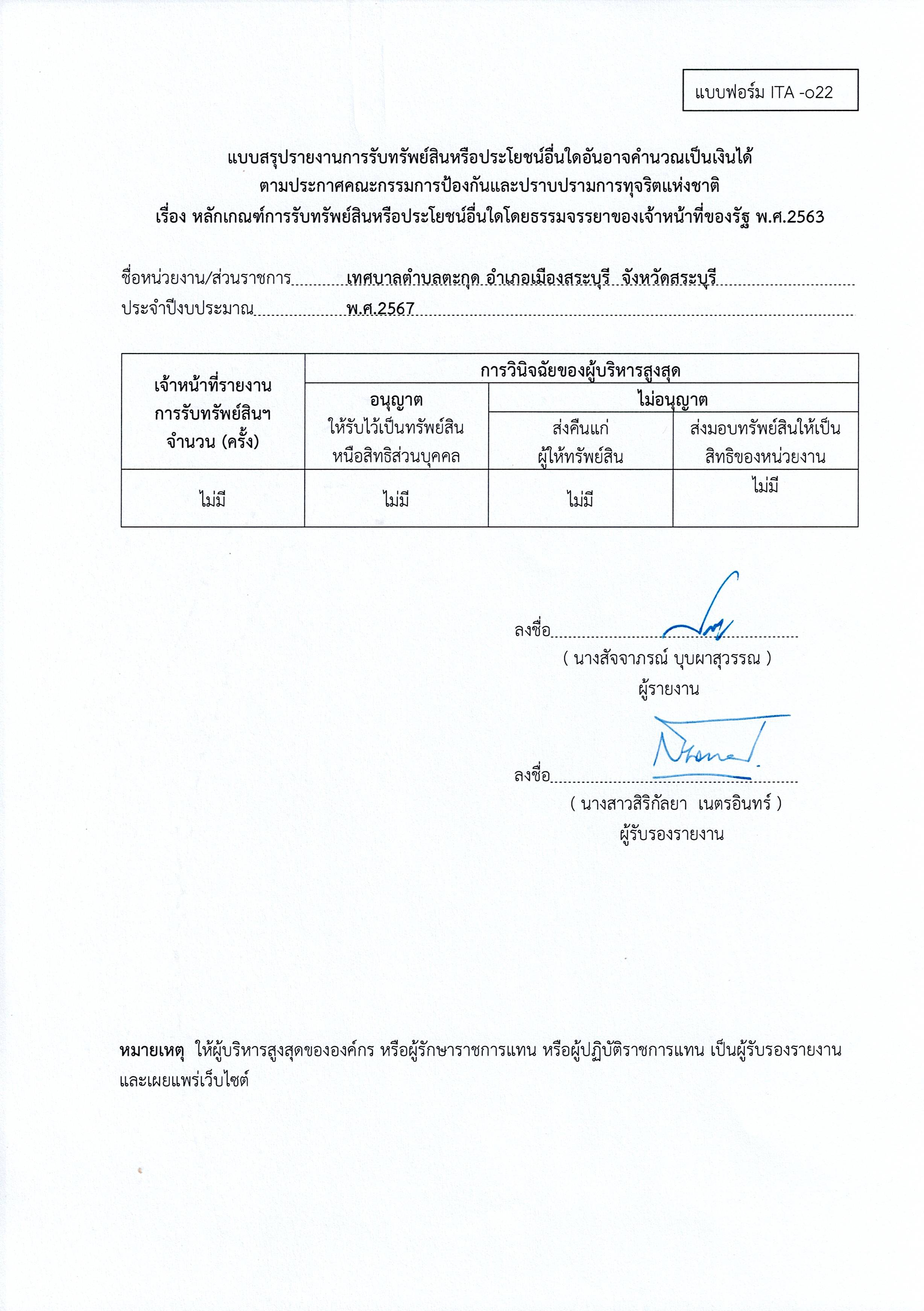 รายงานการรับทรัพย์สินหรือประโยชน์อื่นใดโดยธรรมจรรยา ประจำปี 2567