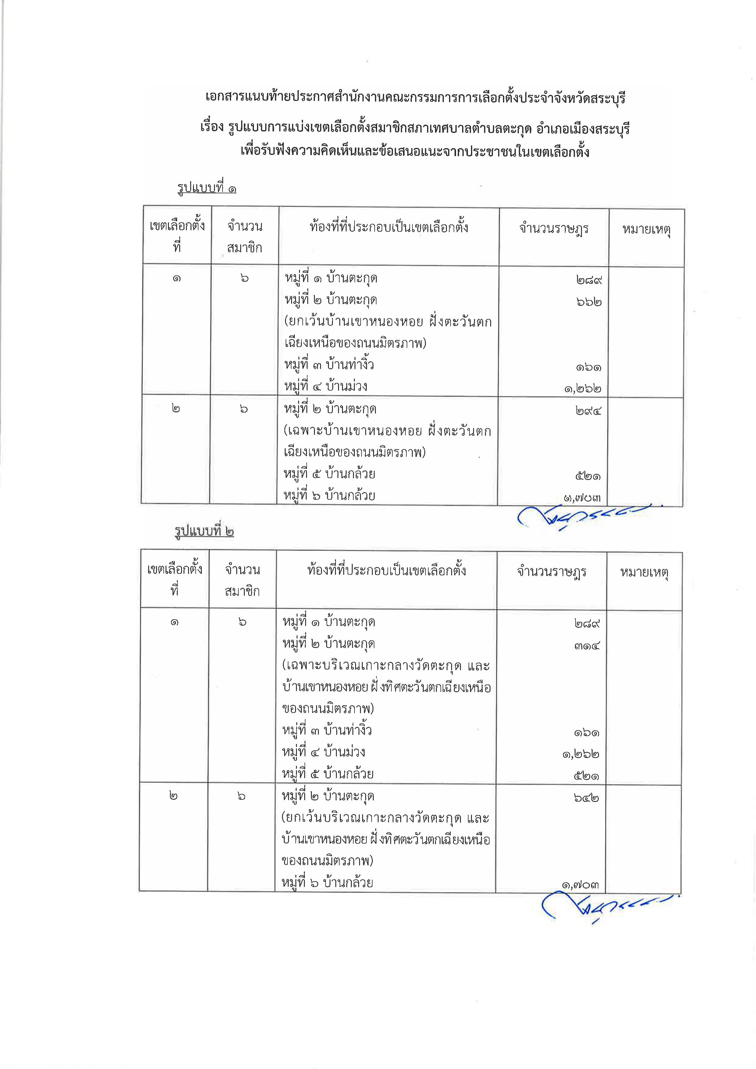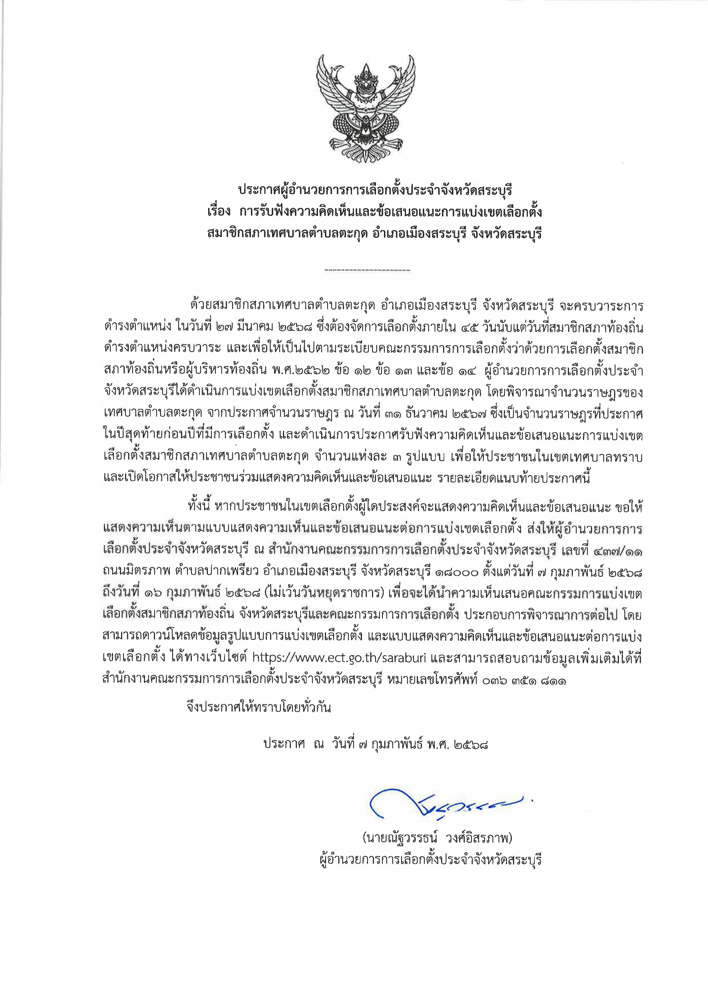 ประกาศผู้อำนวยการเลือกตั้งประจำจังหวัดสระบุรี เรื่อง การรับฟังความคิดเห็นและข้อเสนอแนะการแบ่งเขตเลือกตั้งสมาชิกสภาเทศบาลตำบลตะกุด อำเภอเมืองสระบุรี จั