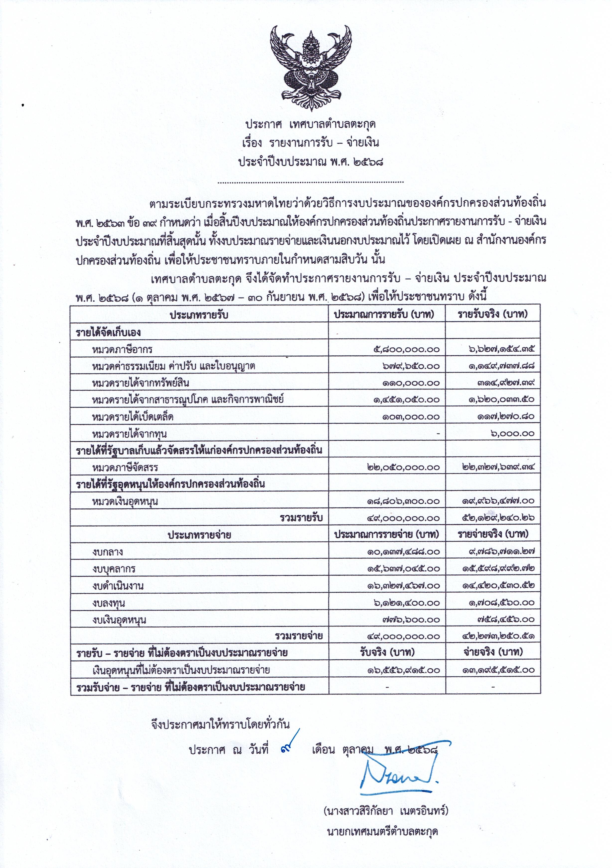 ประกาศเทศบาลตำบลตะกุด เรื่อง รายงานการรับ - จ่ายเงิน ประจำปีงบประมาณ พ.ศ. ๒๕๖๘
