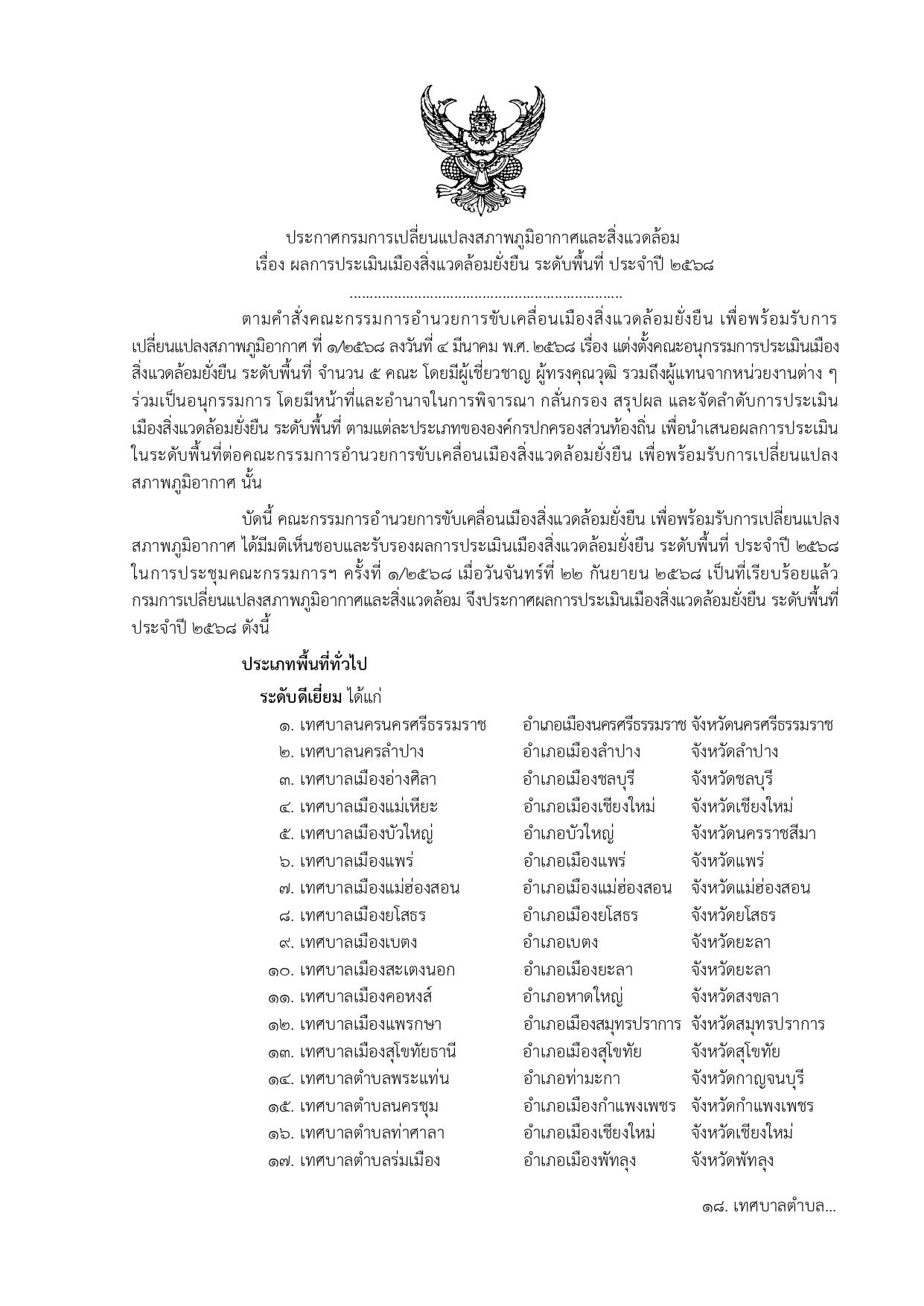 ชื่อเรื่อง : ประกาศผลการประเมิน “เมืองสิ่งแวดล้อมยั่งยืน ระดับพื้นที่ ประจำปี 2568”