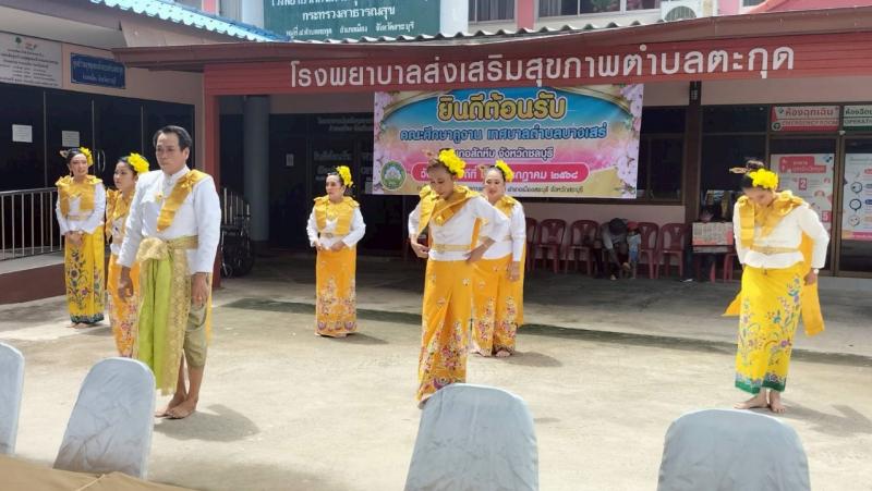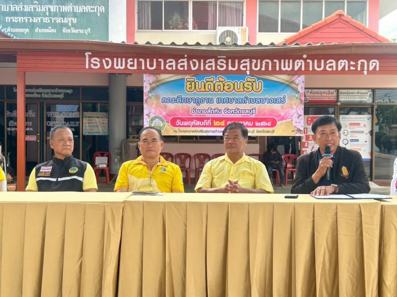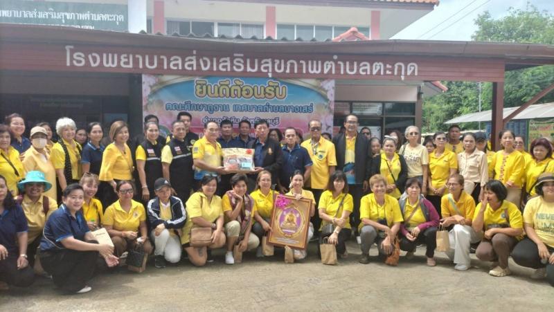 รายละเอียด : วันพฤหัสบดีที่ 24 กรกฎาคม 2568 เวลา 13.00 น. นางสาวสิริกัลยา เนตรอินทร์ นายกเทศมนตรีตำบลตะกุด มอบหมายให้นายมานพ แสงสว่าง รองนายกเทศมนตรี และเจ้าหน้าที่เทศบาล ร่วมกับโรงพยาบาลส่งเสริมสุขภาพตำบลตะกุด ฝ่ายปกครอง ชมรมผู้สูงอายุ ทต.ตะกุด และอสม. ร่วมต้อนรับและถ่ายทอดความรู้ในเรื่อง “ การดำเนินงานด้านชุมชนที่เป็นมิตรกับผู้สูงอายุ“ ให้กับคณะศึกษาดูงานจากเทศบาลตำบลบางเสร่ อำเภอสัตหีบ จังหวัดชลบุรี จำนวน 120 ท่าน ณ อาคารอเนกประสงค์โรงพยาบาลส่งเสริมสุขภาพตำบลตะกุดโดยในงานยังมีการแสดงสินค้าผ้าอัตลักษณ์ท้องถิ่นของตำบลตะกุด ”ผ้าลายตะกุด , Popcornหลากรส โดย ทต.ตะกุด , สินค้าและผลิตภัณฑ์ผ้า Handmade หมู่ที่ 6 และขนมไทย เพื่อเป็นการประชาสัมพันธ์สินค้าของตำบลตะกุดให้แก่ผู้เข้ารับการศึกษาดูงาน