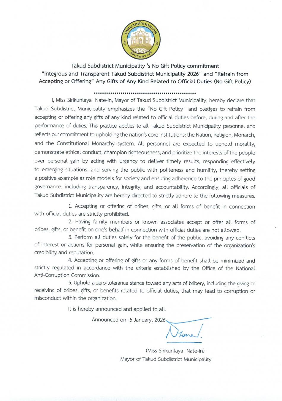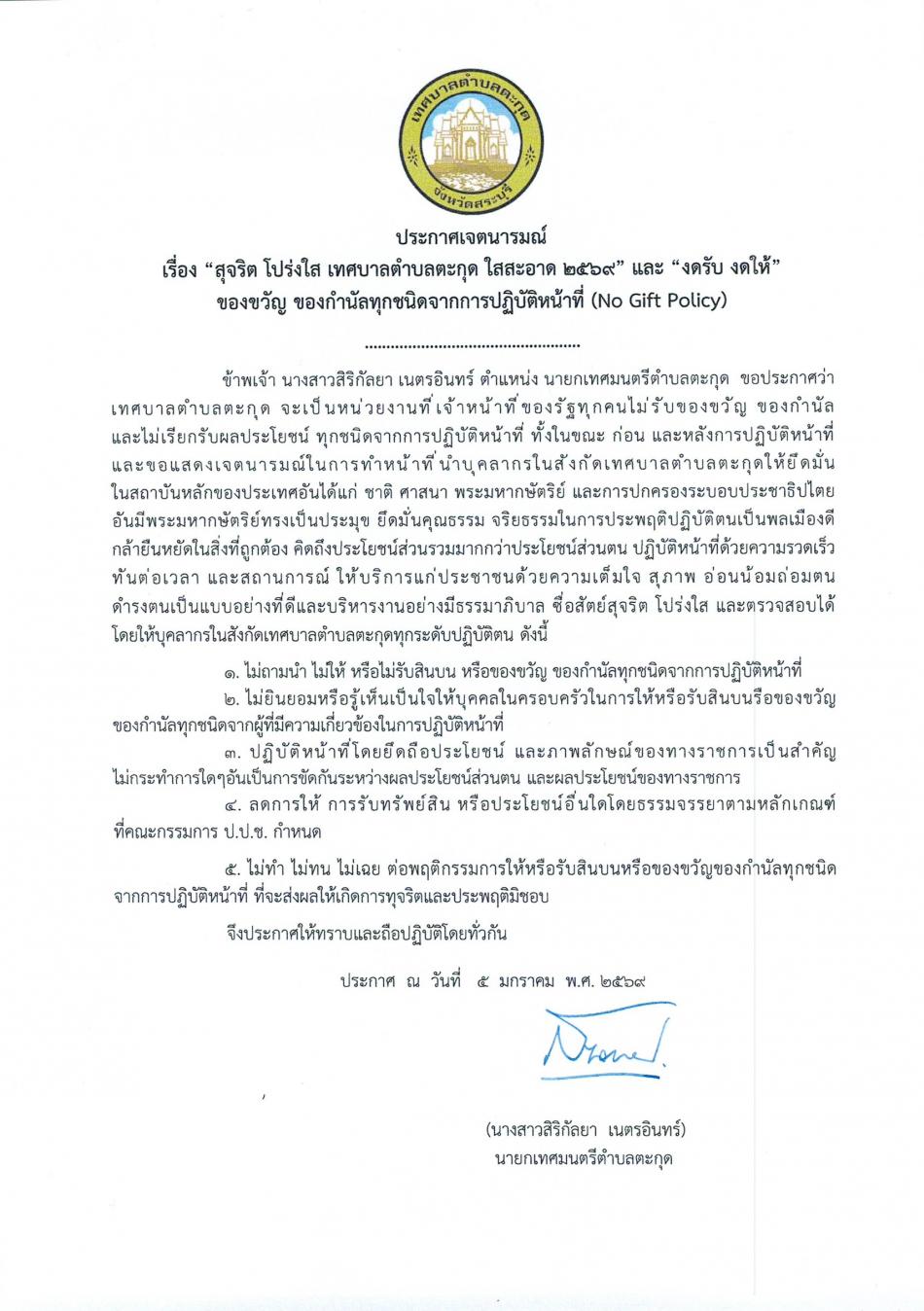 check_box ประกาศเจตนารมณ์นโยบาย No Gift Policy จากการปฏิบัติหน้าที่