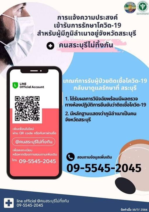 ประชาสัมพันธ์ เรื่อง แจ้งประสงค์เข้ารับการรักษาโควิด-19 สำหรับผู้มีภูมิลำเนาอยู่ในจังหวัดสระบุรี