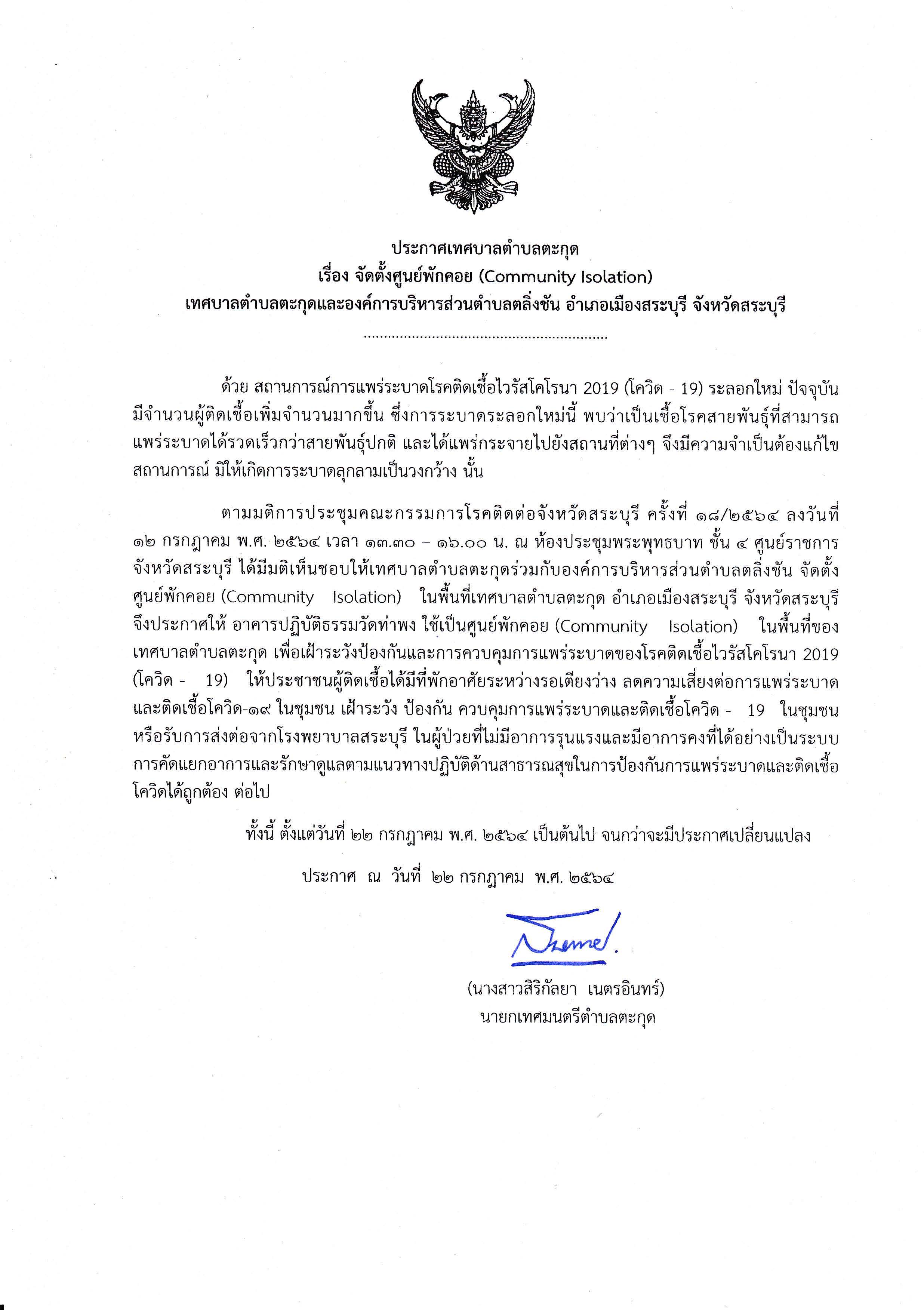 ประกาศเทศบาลตำบลตะกุด เรื่อง จัดตั้งศูนย์พักคอย (Community Isolation) เทศบาลตำบลตะกุดและองค์การบริหารส่วนตำบลตลิ่งชัน อำเภอเมืองสระบุรี จังหวัดสระบุรี