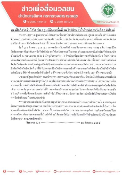 ชื่อเรื่อง : กระทรวงสาธารณสุขเปิดระบบให้ประชาชนที่จะฉีดวัคซีนโควิดเข็มสองของศูนย์ฉีดบางซื่อ เข้ารับการฉีดที่โรงพยาบาลใกล้บ้านได้ตามความสมัครใจ