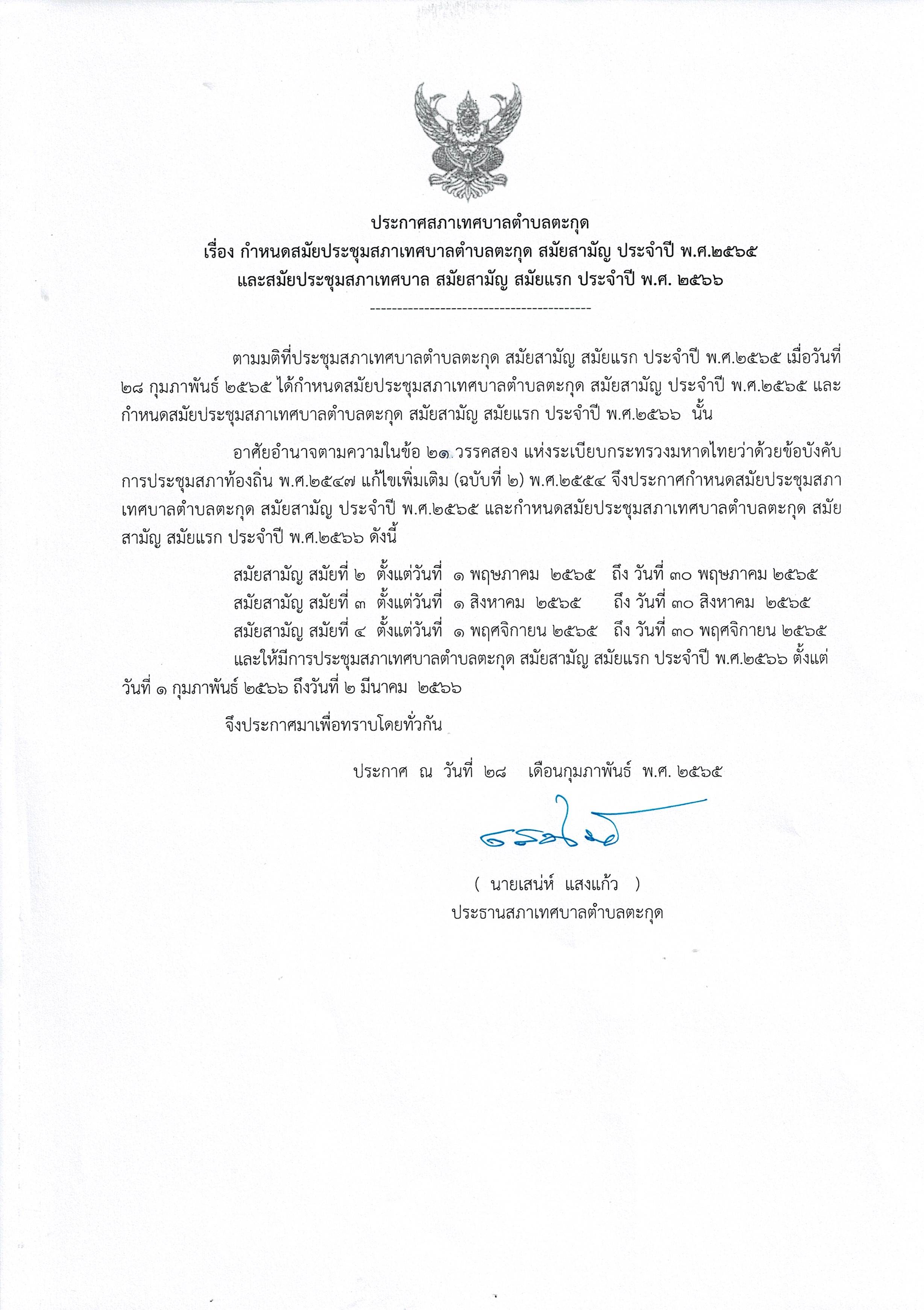 ประกาศสภาเทศบาล เรื่อง กำหนดสมัยประชุมสภาเทศบาลตำบลตะกุดสมัยสามัญประจำปี พ.ศ.๒๕๖๕