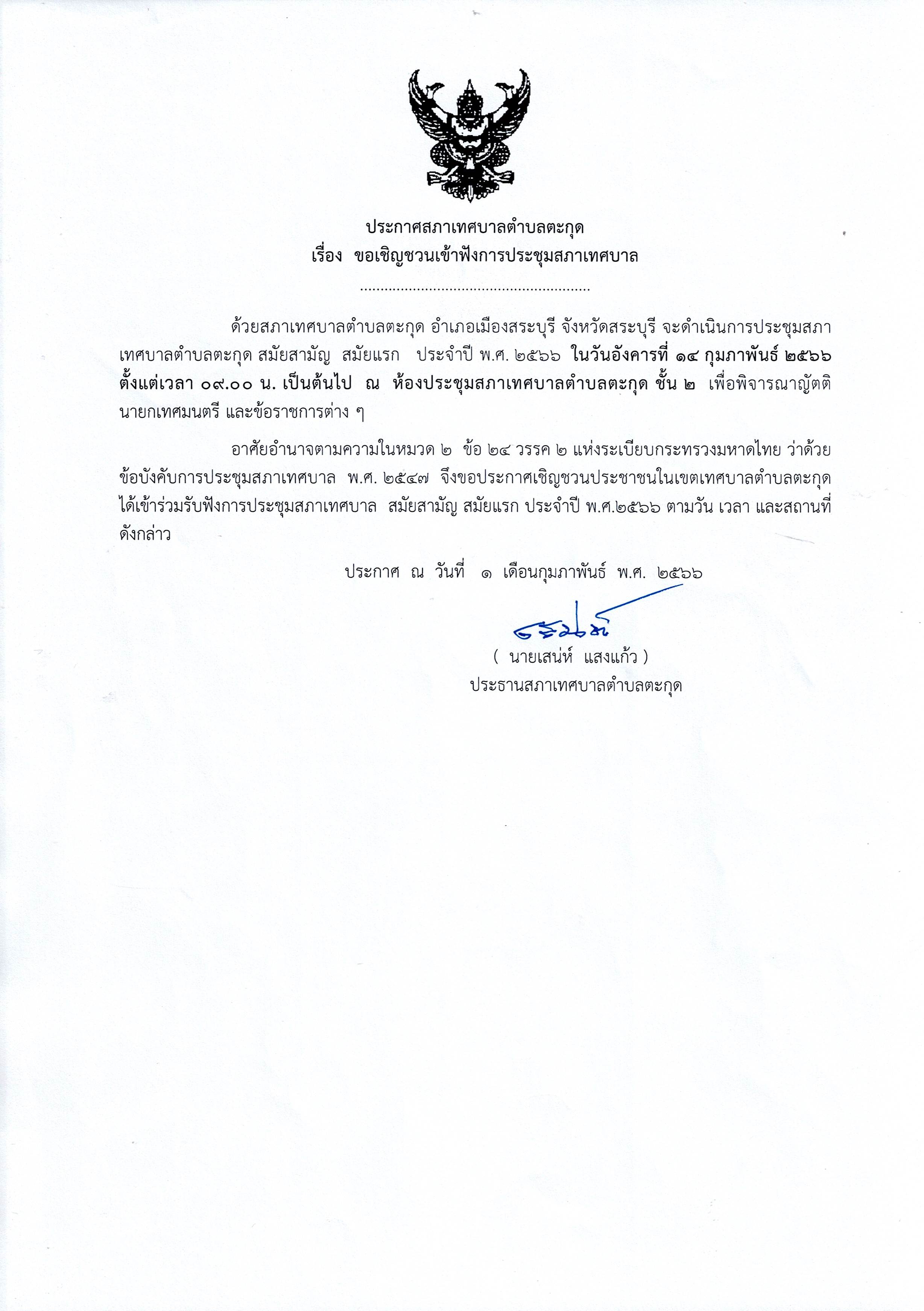 ประกาศสภาเทศบาลตำบลตะกุด เรื่อง ขอเชิญชวนเข้าฟังการประชุมสภาเทศบาล สมัยสามัญ สมัยแรก ประจำปี พ.ศ.2566