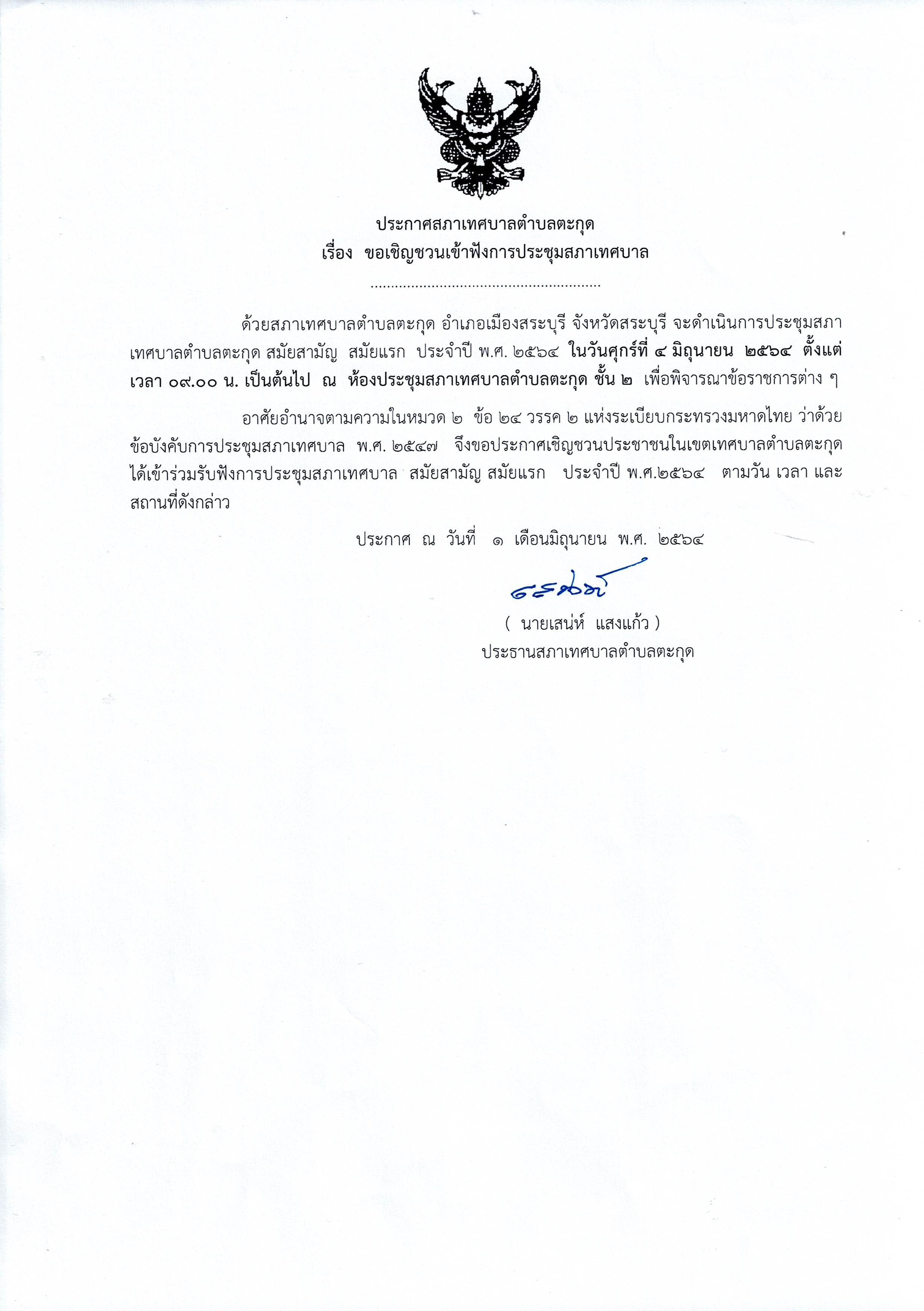 ประกาศสภาเทศบาลตำบลตะกุด เรื่อง ขอเชิญชวนเข้าฟังการประชุมสภาเทศบาล