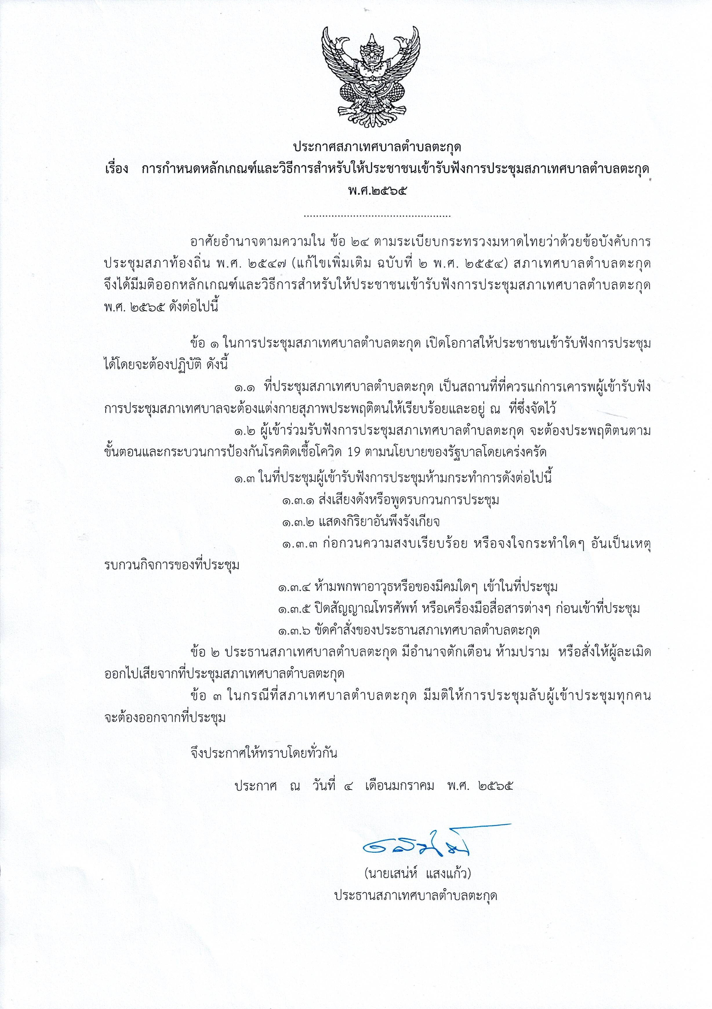 ประกาศสภาเทศบาลตำบลตะกุด เรื่อง การกำหนดหลักเกณฑ์และวิธีการสำหรับให้ประชาชนเข้ารับฟังการประชุมสภาเทศบาลตำบละตะกุด พ.ศ.๒๕๖๕