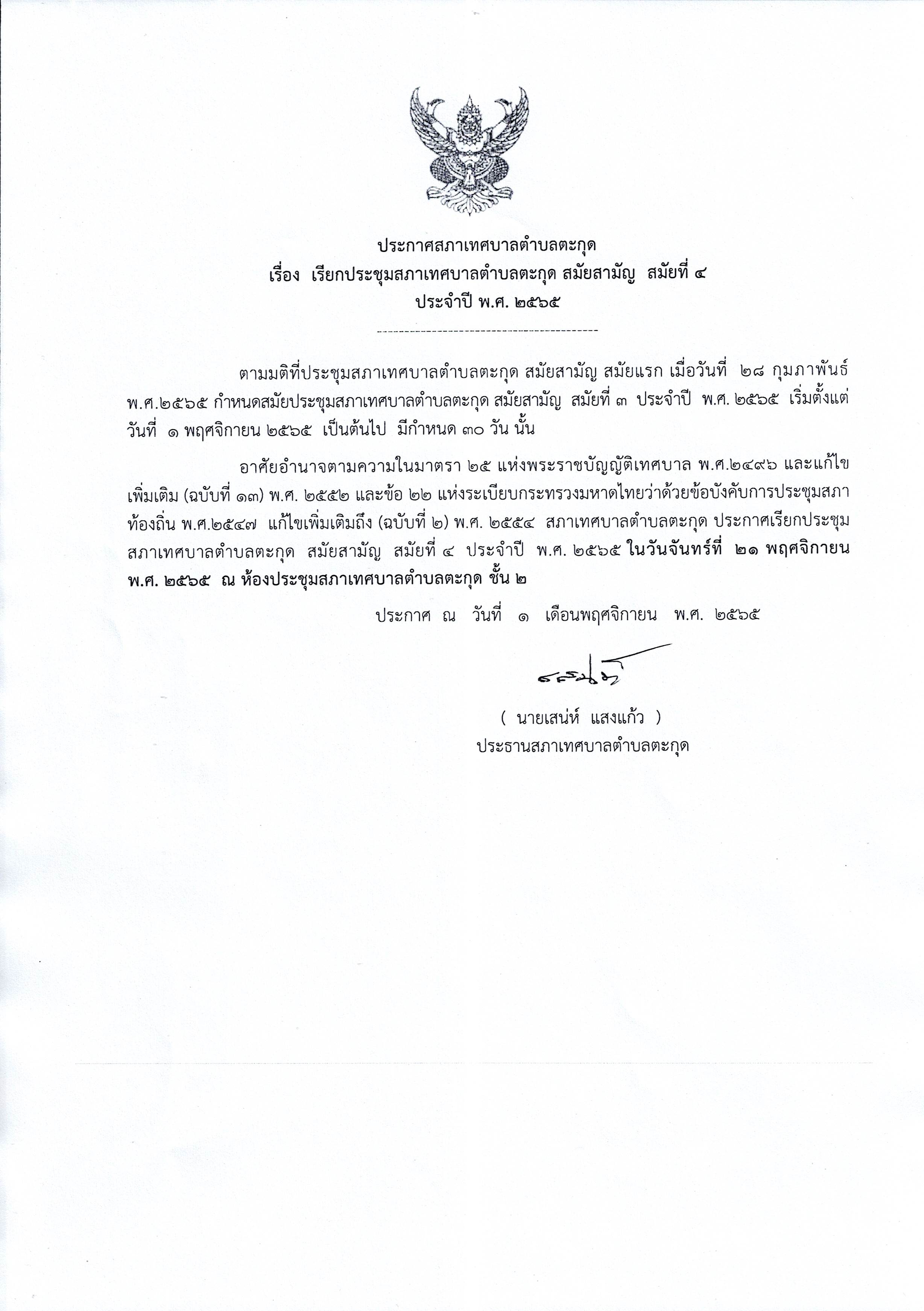 ประกาศสภาเทศบาลตำบลตะกุด เรื่อง เรียกประชุมสภาเทศบาลตำบลตะกุด สมัยสามัญ สมัยที่ ๔ ประจำปี พ.ศ. ๒๕๖๕
