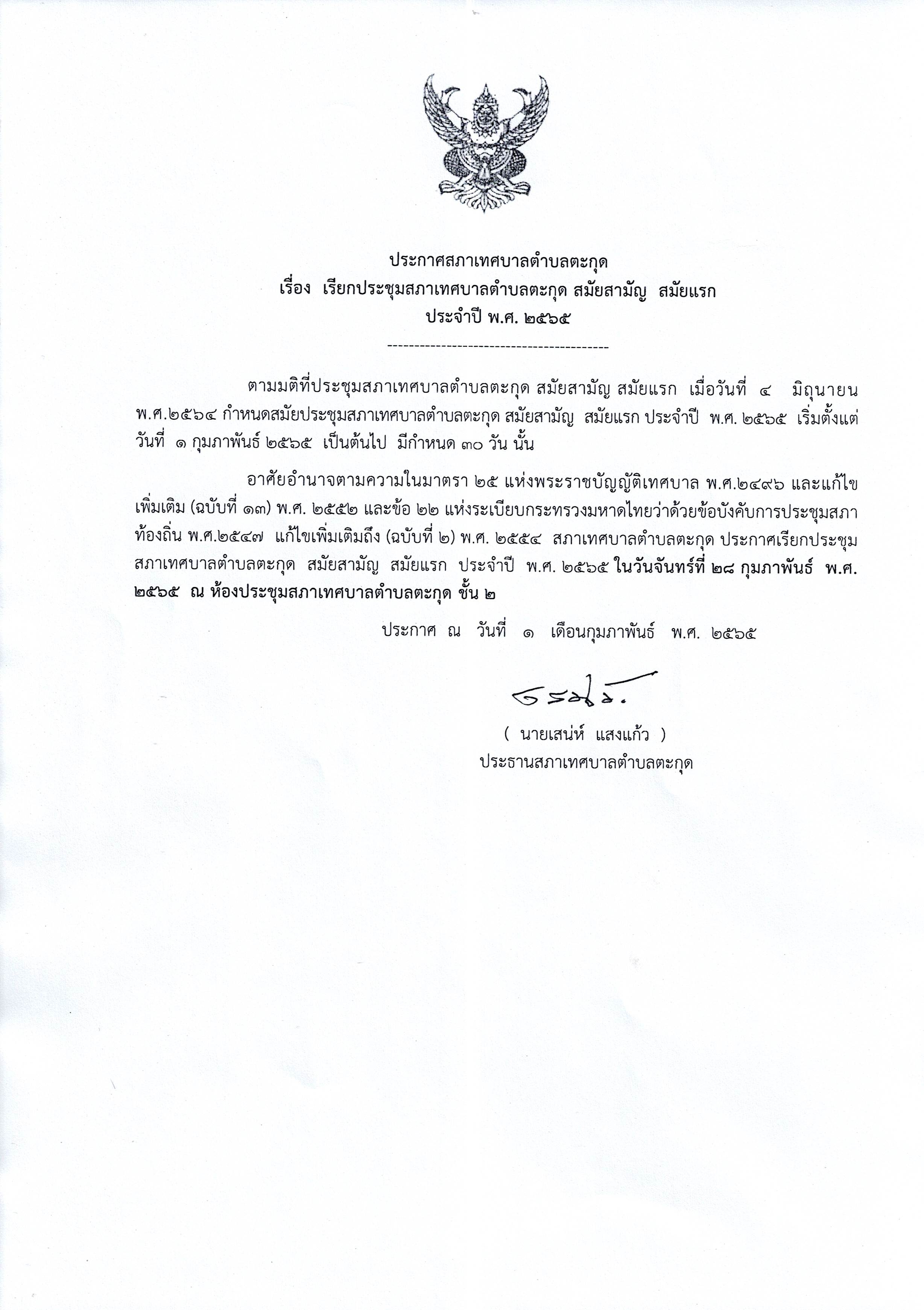 ประกาศสภาเทศบาลตำบลตะกุด เรื่อง เรียกประชุมสภาเทศบาลตำบลตะกุด สมัยสามัญ สมัยแรก ประจำปี พ.ศ. ๒๕๖๕