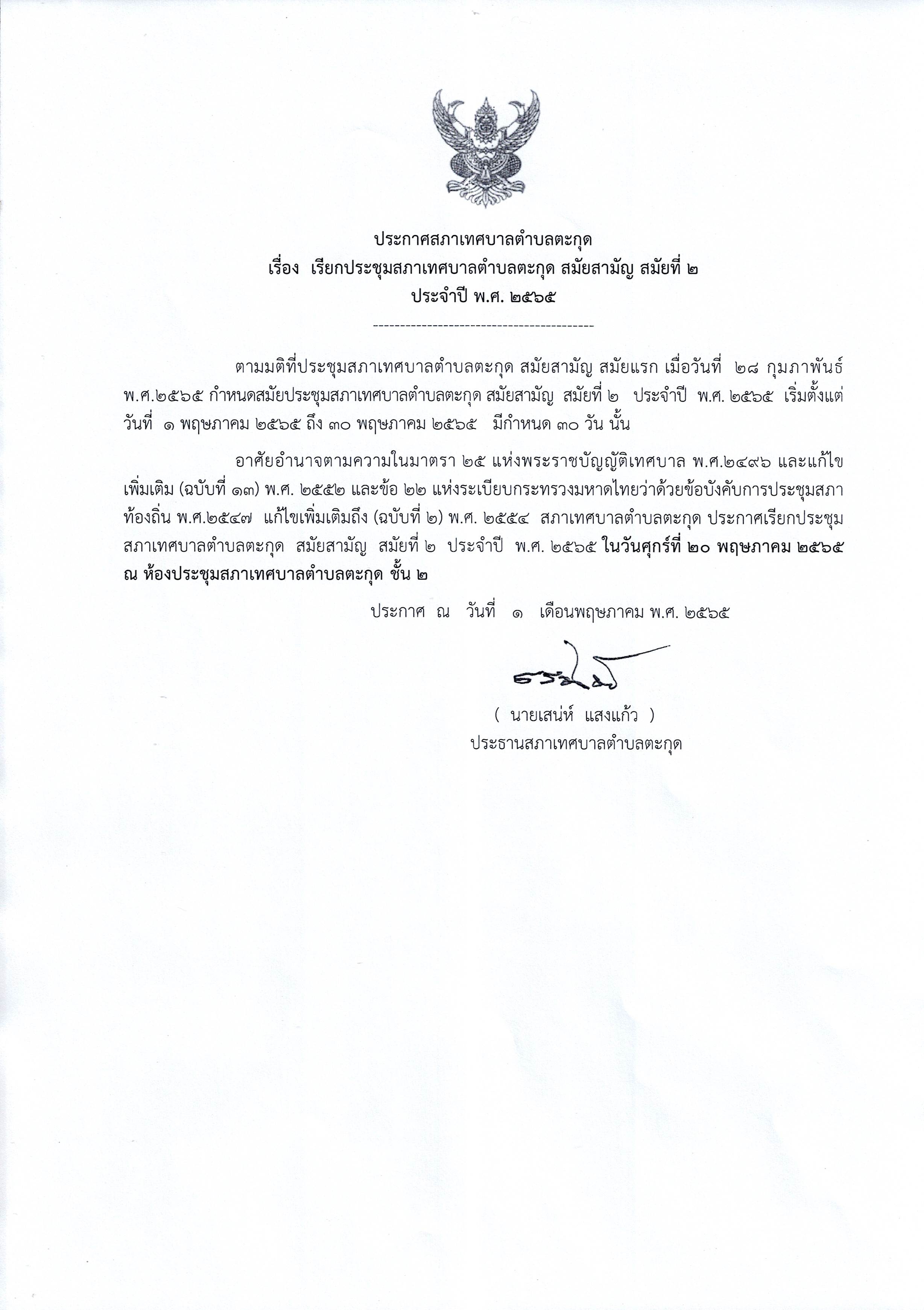 ประกาศสภาเทศบาลตำบลตะกุด เรื่อง เรียกประชุมสภาเทศบาลตำบลตะกุด สมัยสามัญ สมัยที่ ๒ ประจำปี พ.ศ. ๒๕๖๕