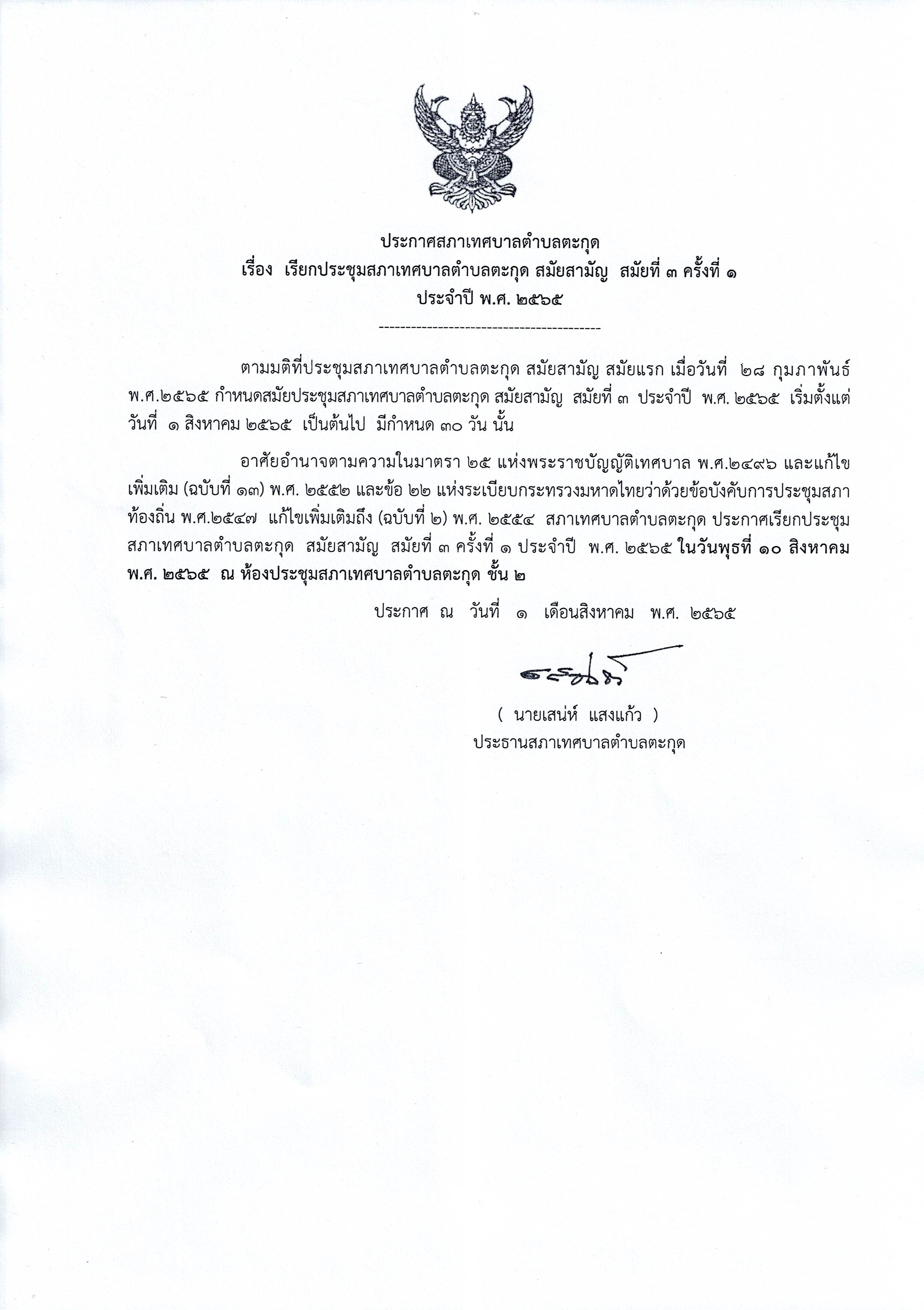 ประกาศสภาเทศบาลตำบลตะกุด เรื่อง เรียกประชุมสภาเทศบาลตำบลตะกุด สมัยสามัญ สมัยที่ ๓ ครั้งที่ ๑ ประจำปี พ.ศ. ๒๕๖๕